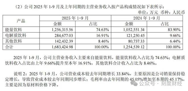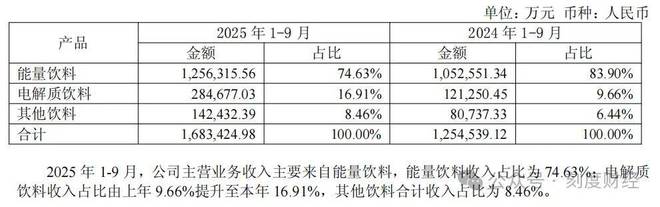从同比增长来看,2024年1-9月电解质饮料营收为12.13亿元,2025年同期营收同比增长超134.7%,增速远超公司整体主营业务营收34.19%的增长水平,成为驱动公司业绩增长的关键动力。