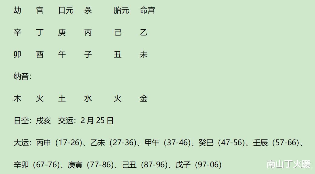 大运丙杀合辛劫,流年、小限癸伤生乙财;大运申合子,流年卯合未,小限未合卯。