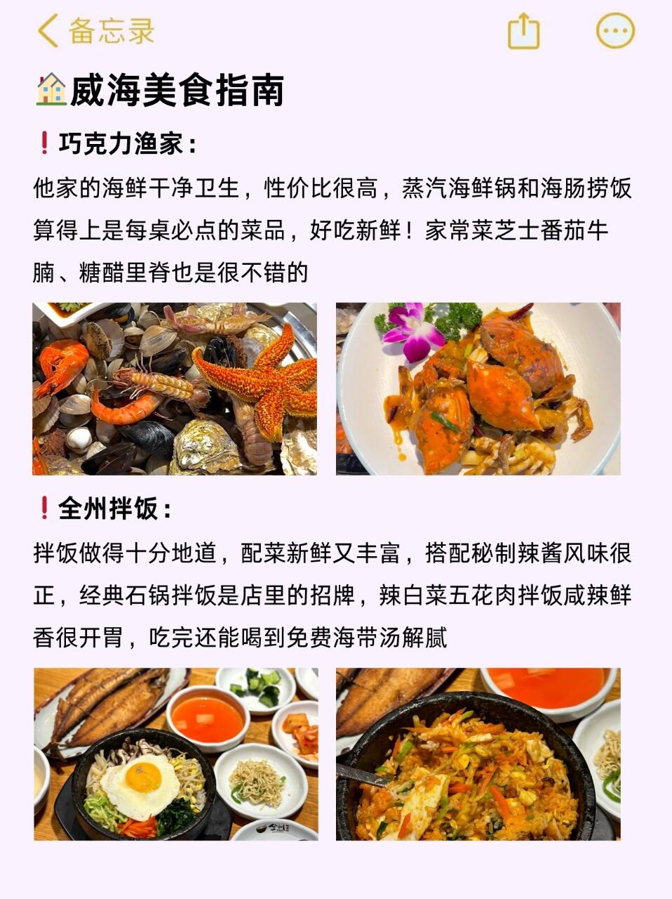 ✅吃海鲜就直接去巧克力渔家!他家的海鲜蒸汽锅真的绝了,蒸出来的海鲜又鲜又嫩,还有海肠捞饭、鲅鱼饺子🥟都很不错😋想吃韩餐可以去✅全州拌饭,拌饭很正宗,而且加的小料也非常多❗