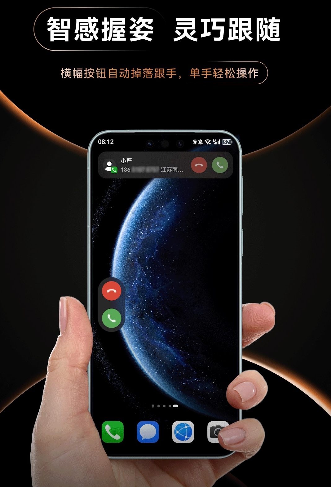 在忙碌的新年准备中,当一只手拎着年货,另一只手操作手机时,华为Mate 70系列能精准识别左右手握持状态,有通话/视频/会议通知时,会单独提供按钮在操作手那一边,单手也能轻松接听电话。无论左右手如何切换,操作按钮始终“如影随形”,极其人性化。同样的场景,使用其他手机只能去点击屏幕顶部的横幅通知,单手基本操作不了,体验差点意思。