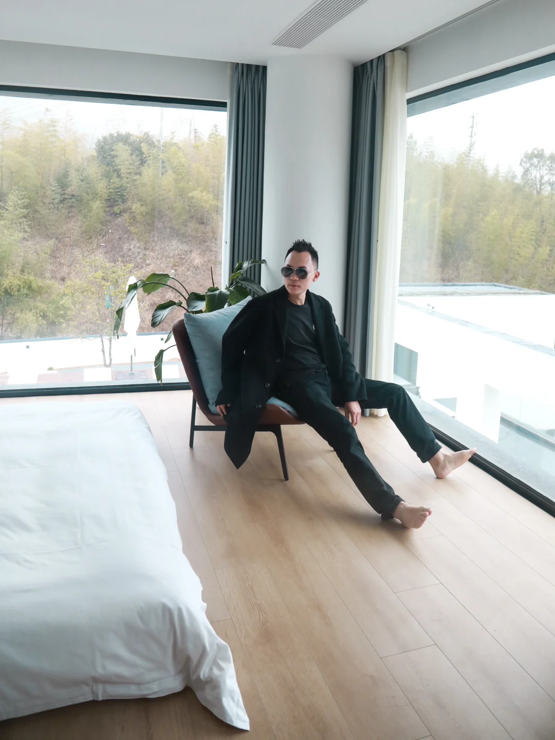 大大的落地玻璃窗,就像把莫干山的美景变成画框中的山水画卷。不出房门,就可以欣赏到美景