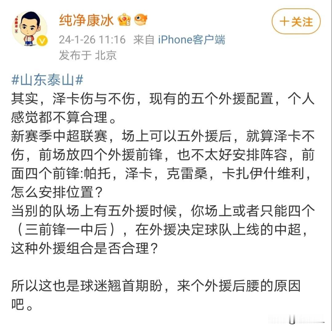 山东泰山官宣,名记质疑崔康熙的引援策略。 泰山官方宣布泽卡、卡扎、高准翼、毕津浩、彭欣力五名新援加盟,这基本上宣告泰山队内外援调整基本结束,至少亚冠淘汰赛之前很难再有其他新援加入,泰山队球迷一直苦等的后腰外援终究还是没能到来。 名记康冰发文表示,泰山队五外援配置极不合理,前场扎堆,中后场缺人。对此,你怎么看?