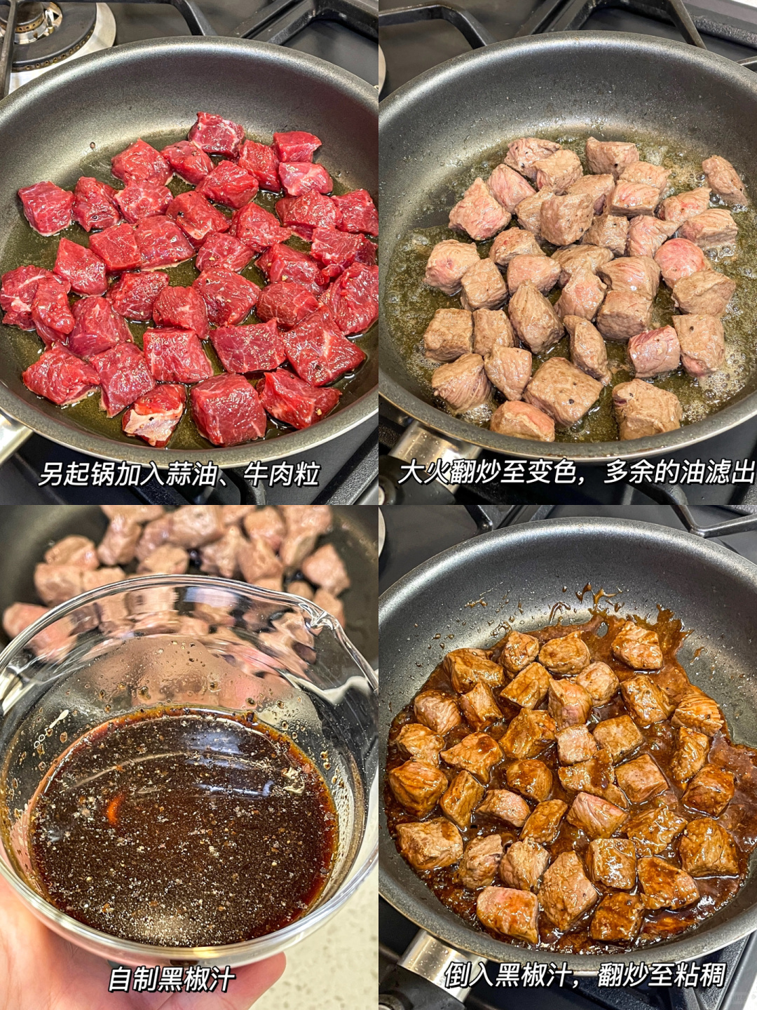 🧄黑椒金蒜牛肉粒 ❶牛里脊切长条,在切成大小一致的正方形。 ❷牛肉粒中放入黑胡椒、海盐、生抽、食用油,抓匀腌制。 ❸锅中放油,冷油下入蒜粒,中小火炸至金黄色捞出,蒜油保留。 ❹平底锅放蒜油,放入牛肉粒大火炒至断生,多余的油倒掉,放入调好的黑椒汁,翻炒至酱汁粘稠后加入蒜粒,出锅前撒大量黑胡椒。 🏷️记住这个万能的黑椒汁配方,调味料都很日常,味道经典百搭,做西餐或意面都适合。