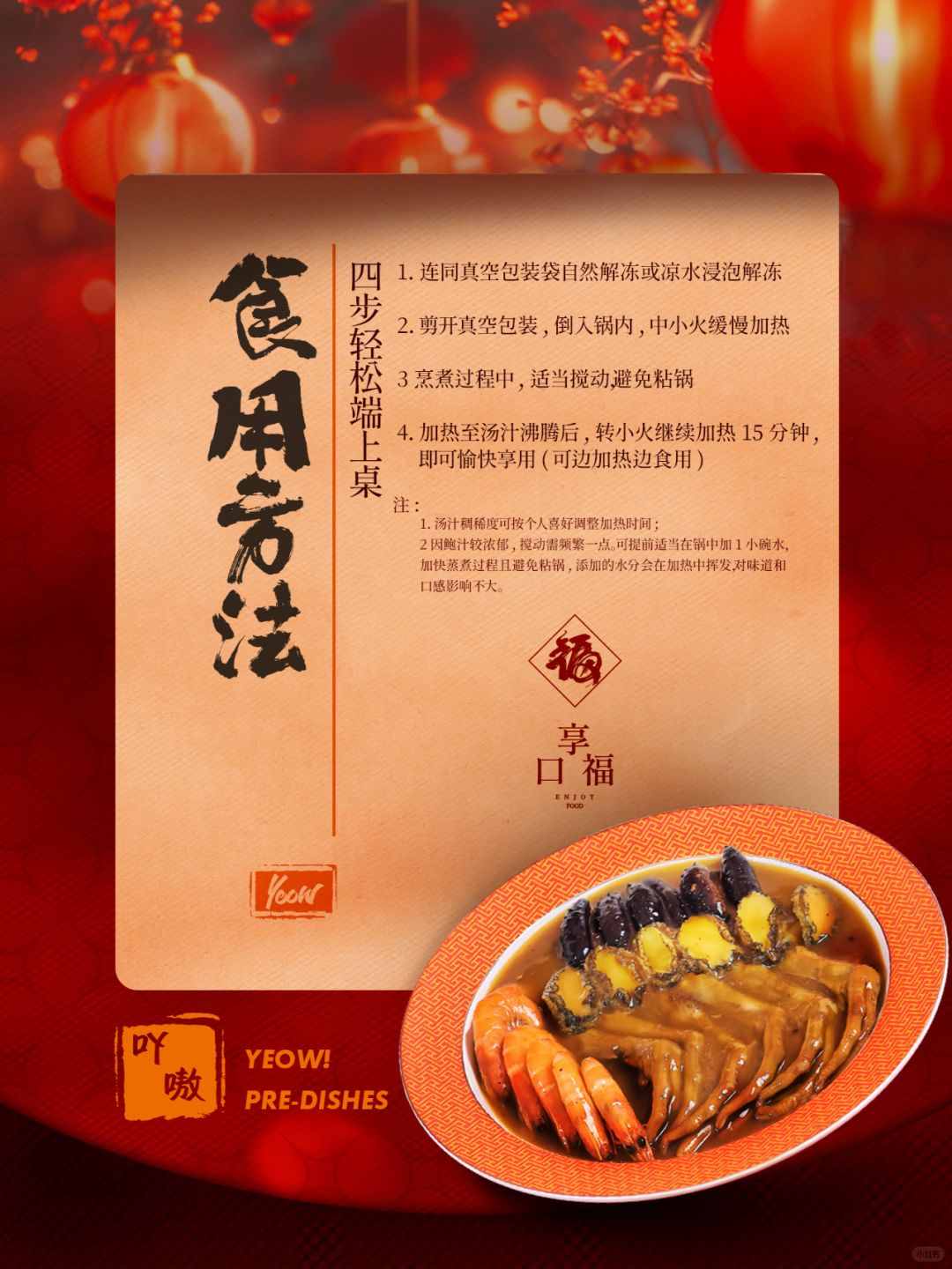 最后一张是食用方法介绍!需要求助随时咨询小嗷即可 TIPS:1:汤汁浓稠度可根据个人喜好调整加热时间 2.鲍汁较为浓郁,可在锅中提前加一小碗水,加快蒸熟过程并且避免粘锅,水分易蒸发不影响鲍汁口感。