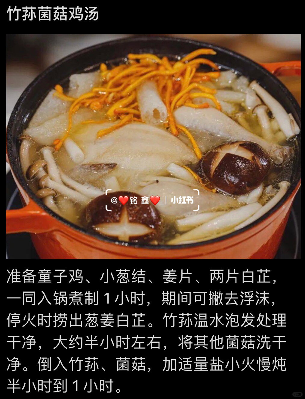 年夜饭C位菜烤鸡、炖鸡、口水鸡、白斩鸡做法 烤鸡 鸡放大盆中加五香粉.蚝油.生抽.黑胡椒粉.大蒜碎腌两小时多翻面完成后去表面多余酱汁和大蒜碎.烤箱上下120 度烤一小时。 小土豆带皮洗净对半切开.热油小火煎至金黄.鸡肉烤完刷层蜂蜜铺满土豆.再次放烤箱180 度烤 30 分钟 白斩鸡 凉水深锅加水.小葱结.姜片.料酒煮开后把鸡分三次每次十几秒把鸡烫一下.之后把鸡放回锅中大火煮开转小火煮15分关火焖15分.筷子插进鸡腿至没有血流出即可. 灵魂蘸料:沙姜末.蒜末.另一份小葱碎.蒜末.将热油浇两分蘸料上加生抽拌匀即可。 竹荪菌菇鸡汤 准备童子鸡、小葱结、姜片、两片白芷,一同入锅煮制 1 小时,期间可撇去浮沫,停火时捞出葱姜白芷。竹荪温水泡发处理干净,大约半小时左右,将其他菌菇洗干净。倒入竹荪、菌菇,加适量盐小火慢炖半小时到 1 小时。 口水鸡 起锅加水放葱.姜片.花椒.童子鸡.大火开转中火煮 10 分关火焖 10 分.煮好放凉.鸡汤备用.准备小米椒.香葱段.蒜末.海鲜酱油.香醋.白糖.油泼辣子兑适量鸡汤调酱汁.鸡肉切块摆盘.浇酱汁撒白芝麻浇一大勺红油即可。油泼辣子浸润后的鸡肉,又麻又辣。