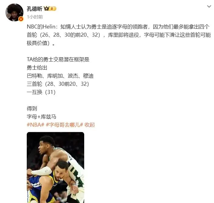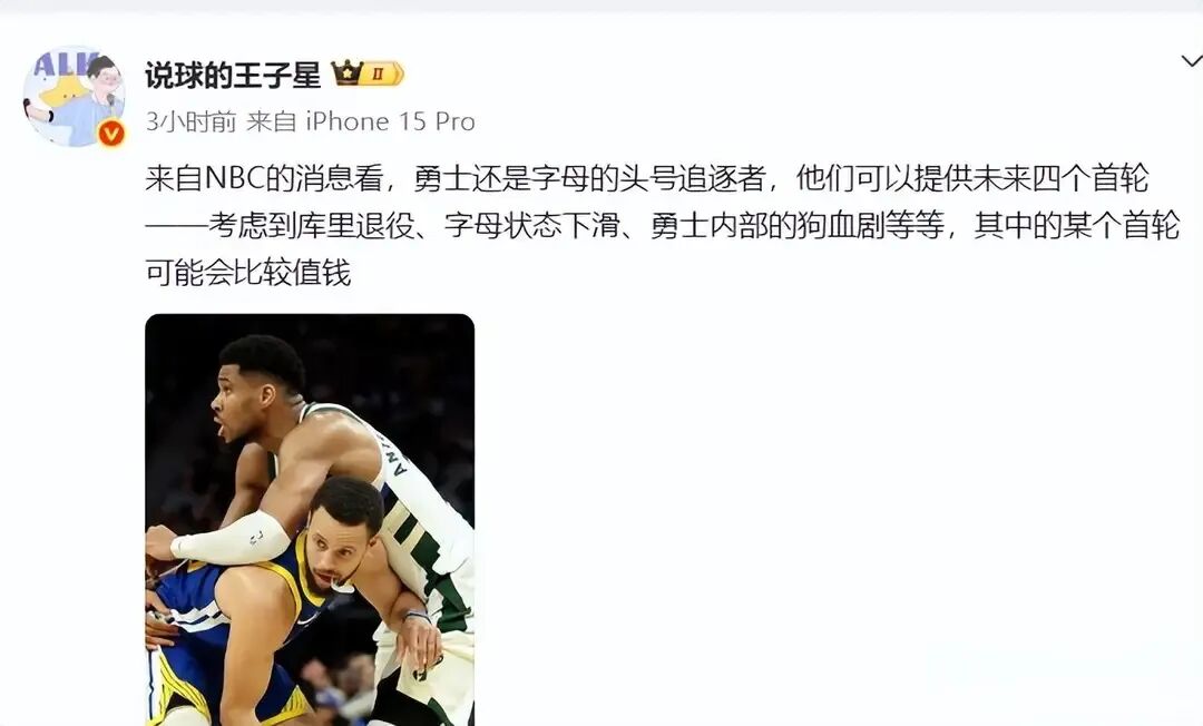 也写道:“来自NBC的消息,勇士还是字母哥的头号追求者,他们能拿出未来四个首轮签。