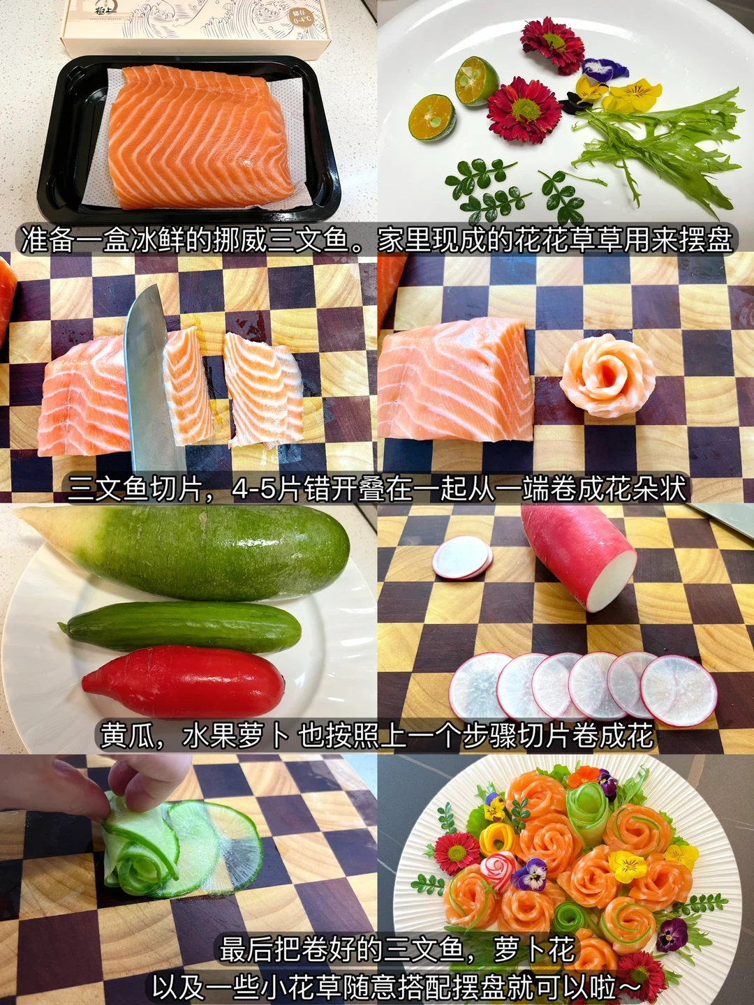 家里买三文鱼一直都是选挪威三文鱼,色泽很漂亮、纹理清晰、肉质鲜嫩、入口即化,这次搭配其它蔬菜水果做了花朵拼盘,我自己都忍不住想自夸了[偷笑R]
