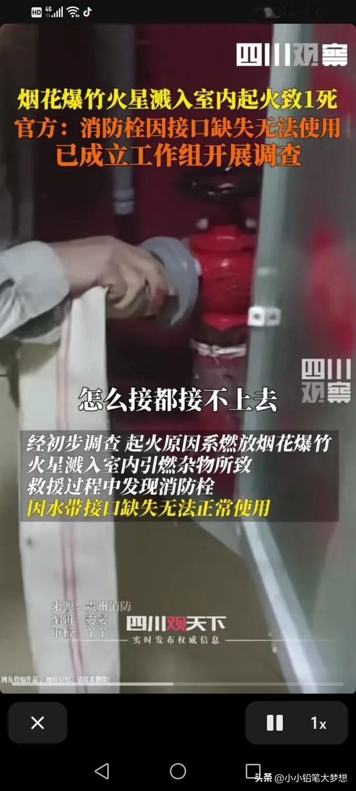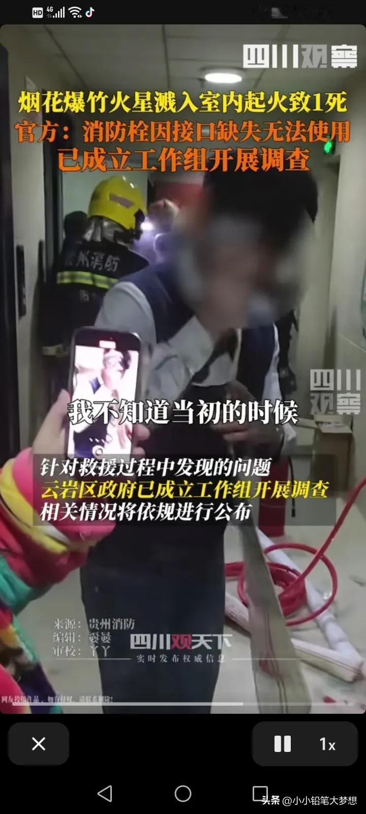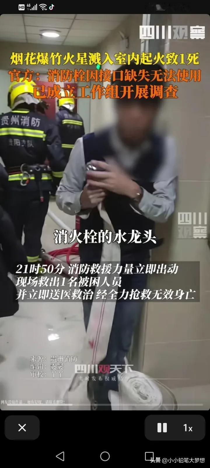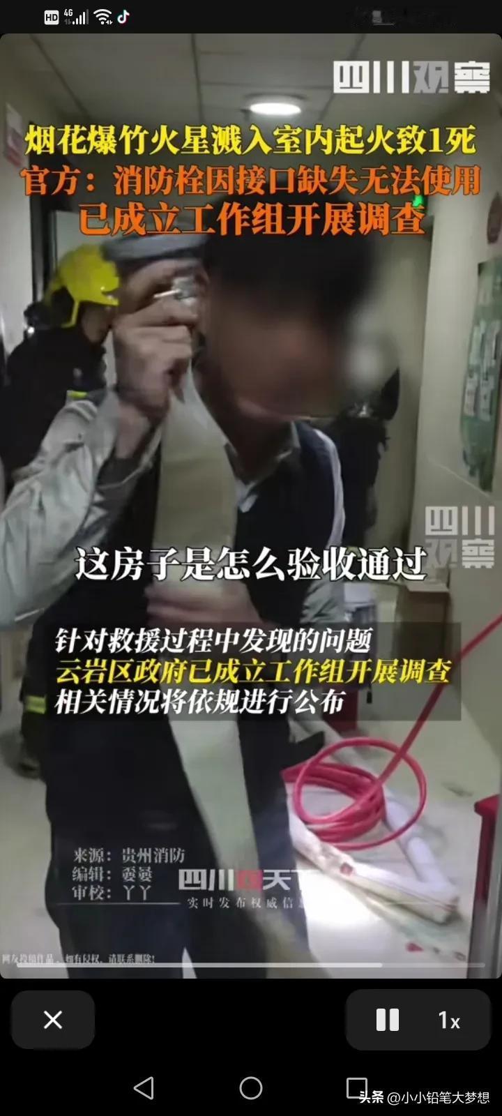 过年了,但是他的妈妈却不在了,他会使用消防栓,但是却没救下他的妈妈,原因就是消防栓的水龙头怎么样都接不上去!他声嘶力竭的质问,这房子的消防是怎么验收的,怎么交的房?!到底是谁的责,谁验收的? 1月30号晚上九点多,贵州省贵阳市云岩区消防救援大队接到一例火警,起火原因是因为烟花爆竹火星溅到14楼房间里面。 这名男子他懂得用消防栓,可是因为消防栓接不上,他眼睁睁的看着自己的妈妈被困,送院之后不治身亡,这种悲痛是绝望的,无能为力的!你说这家人这个年怎么过! 我仔细的看了视频中消火栓栓头的铝口接头好像没有了,肯定接不上。物业有规定消火栓应该每月进行一次检查,以确保其能够正常使用,看来物业真的不作为! 年底了,大家燃放烟花爆竹一定要注意了,还有消防不合格的小区应该不止这一家吧?这种类似情况一定要严查和排除! #记录我的2024# #我来唠家常#