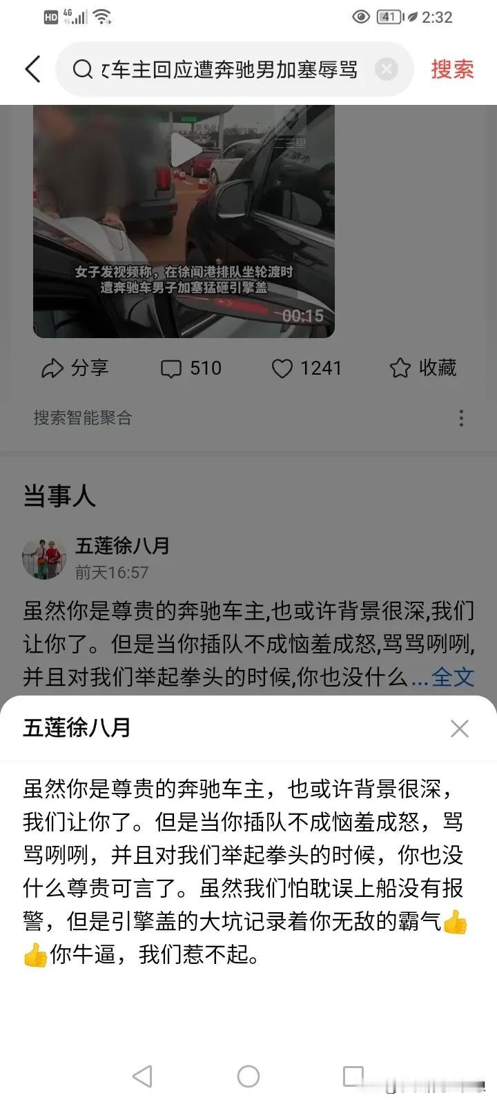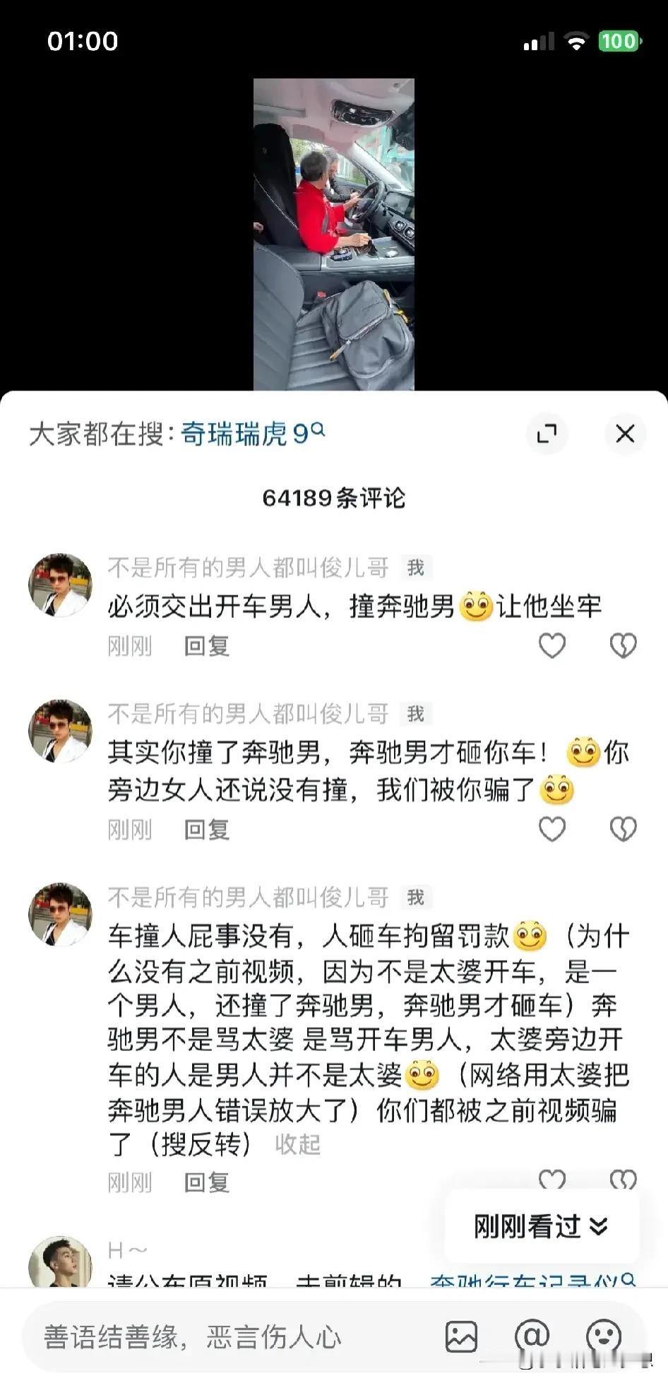奔驰车加塞怒砸引擎盖事件,奔驰车前后公开两段视频之后,奇瑞车副骂驶女士忍不住发声:我们家遭受网暴,我自始至终都没说老太太就是驾驶员。 但是根据头条新闻1月30日报道称,徐女士称“70多岁的妈妈事发时是司机,当时被吓到了,我们对处理结果满意,这事就告一段落了,我们不需要对方赔偿。” 那就是说头条新闻官方号作假了?还是徐女士说谎了? 徐女士还说事情根本就没有反转,我的视频就是最有力的证据,奔驰车一直跟在她们的后面。 她这么说我就有疑问,因为这位女士发过一个视频,奔驰车确实在他右后方第三辆,但那是没有进通道之前的视频,那奔驰车前面的车开走了,那奔驰车跟着开进去有错吗?如果你是驾驶员,你前面的车插到7~10通道分流,你不会跟上去吗? 所以这并不代表奔驰车是加塞上来的,反而,奔驰车公布的行车记录仪很清楚的记录了白车在通道上加塞的过程。 很多人都在讨论这个事情,都在说交规的问题,说什么交替行车,但我觉得交警通报里面根本就没提及到违反交通规则的问题,奔驰男被拘和罚款都是治安的问题。 我们来探讨一下奇瑞车主的问题: 1.奇瑞汽车车主是否有说过自己的老妈就是驾驶员?为什么采访的时候又是这么说的?如果真的是有说过,那就涉嫌炒作,制造舆论在网上造谣滋事了! 2、明明是他们白车加塞,她发视频却是这么说的“尊敬的奔驰车主,或许你的背景很深,我让了你……”明明是他们加塞,而且还撞了人家眼镜男,视频里面也确实看见了眼镜男站在前面,奇瑞驾驶员还继续往前开,这是否涉嫌故意伤人或者危险驾驶? 3、奇瑞车主的视频是经过剪辑的,一开始奔驰男下车的时候,到底说了什么?奇瑞车车主是否有激化矛盾?为什么不把完整的视频公开? 4、奇瑞车车主确实没有打码就把视频发出来,车牌号和肖像,故意引导性的说:“或许你的背景很深”让眼镜男被人肉搜索,是涉嫌侵犯肖像权和网络暴力违法犯罪? #评论区出主意大赛# #我来唠家常#