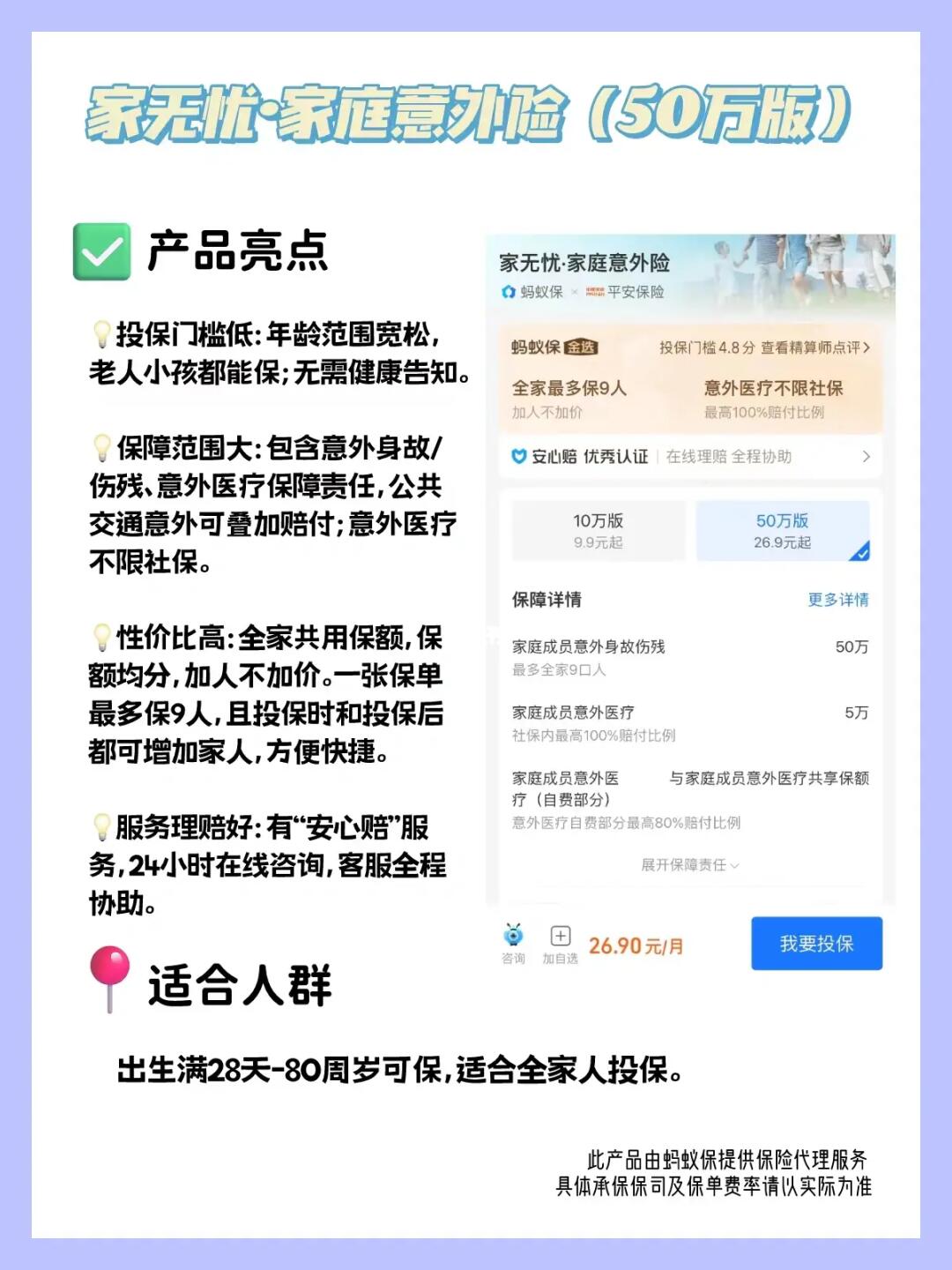 主要是这一款可以多人同时投保,比如说我买,可以给自己老公孩子,还有双方父母一起买,最多可以9个人投保,全家共用保额,保额均分,最关键的是,加人不加价‼️且投保时和投保后都可增加家人,方便快捷。投保的年龄范围也很宽松,28天-80岁,从小孩到老人都能保;也没有健康告知和投保职业门槛,是一款比较合适的家庭基础意外保障