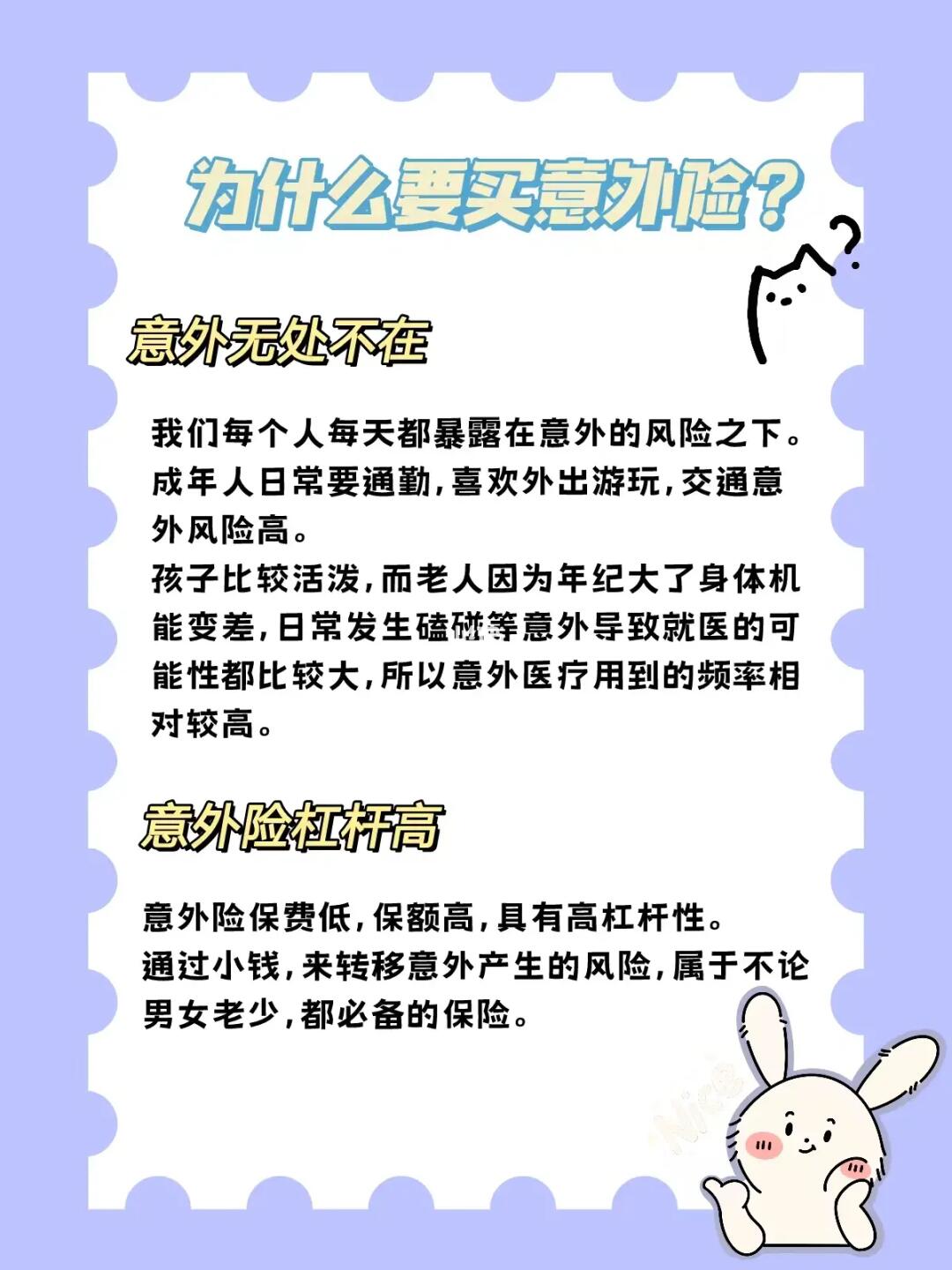 虽然我们都忌讳谈及意外,但无可否认的是,生活中充满了意外。虽然意外险不能为我们规避意外风险,但万一意外发生,我们能有多一份应对之策