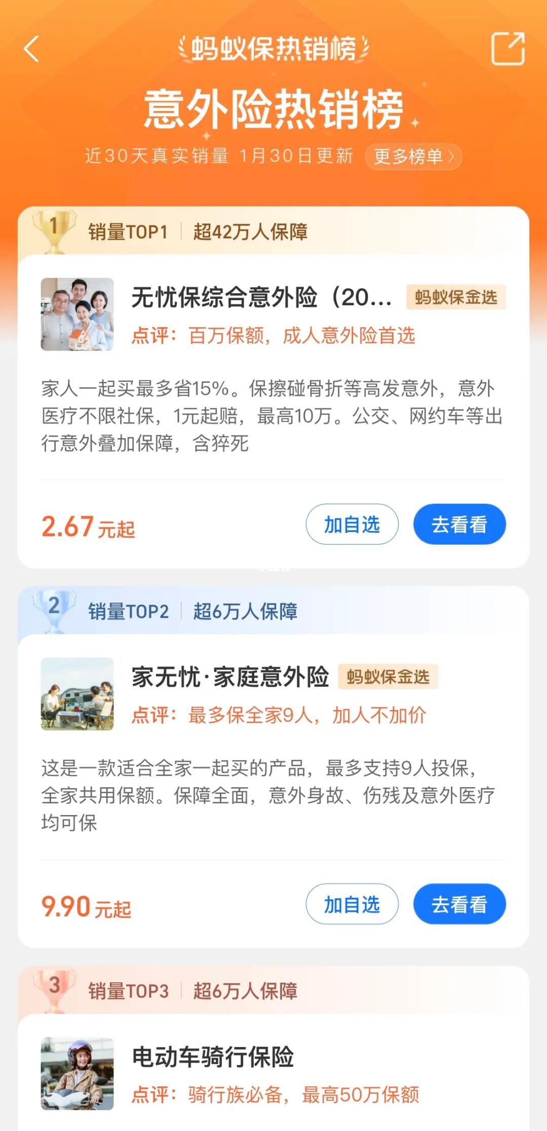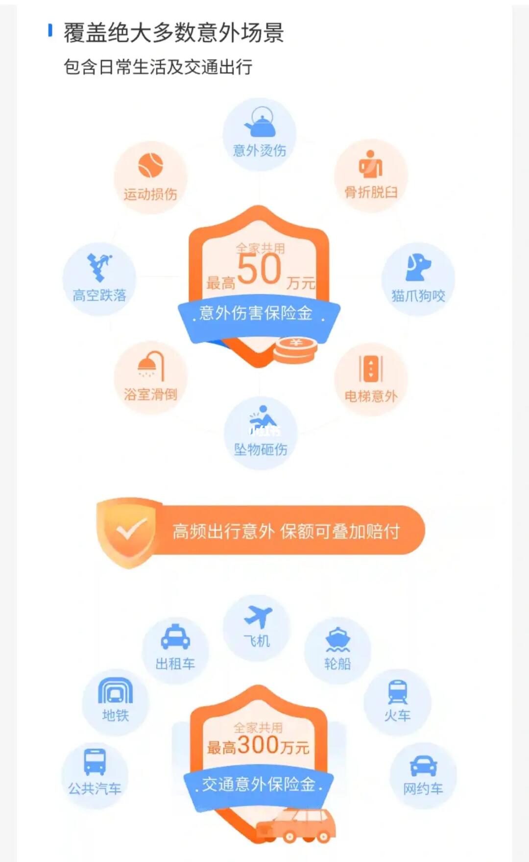 我给父母买的是支付宝上的【家无忧·家庭意外险】,是入选了蚂蚁保金选的产品,意外身故/伤残、意外医疗保障责任,公共交通意外这些都涵盖了,还有像日常容易发生的意外骨折、浴室滑倒,意外烫伤、猫抓狗咬这些意外都可以保,而且意外医疗还不限社保内外,自费药也能报