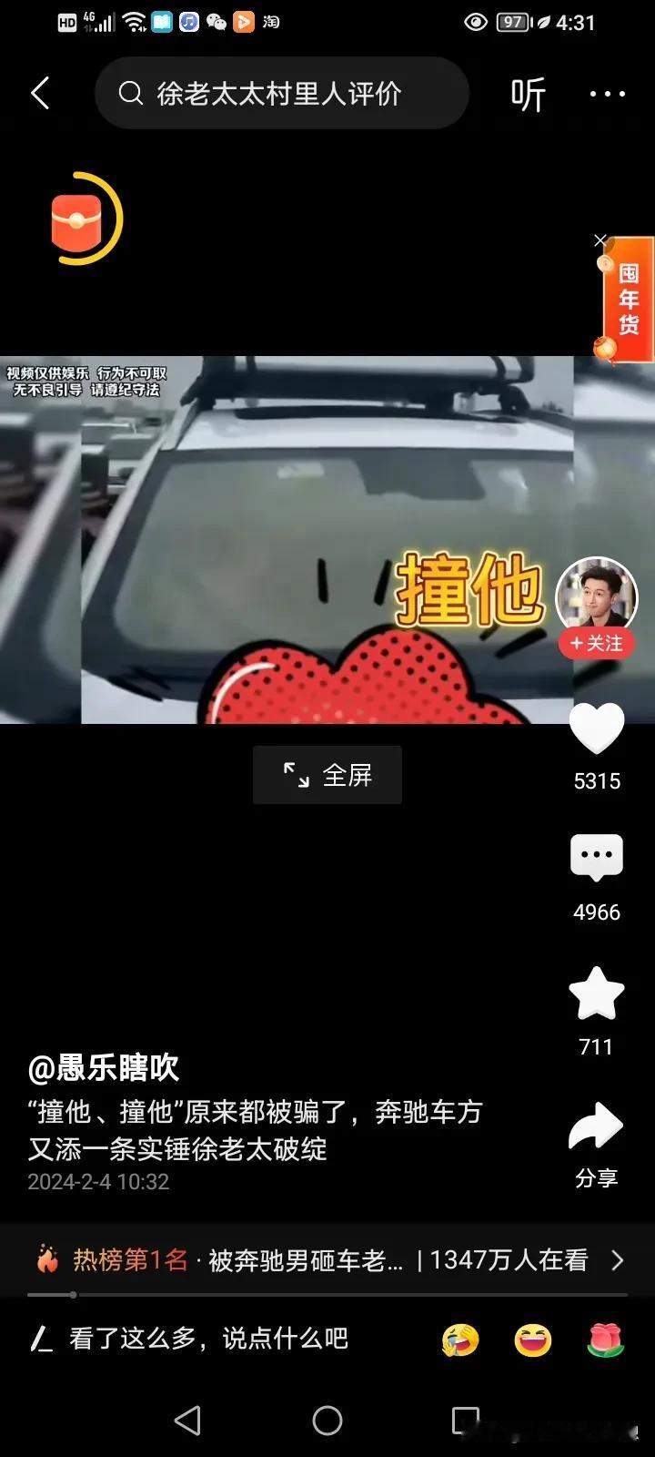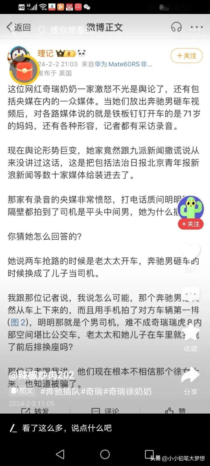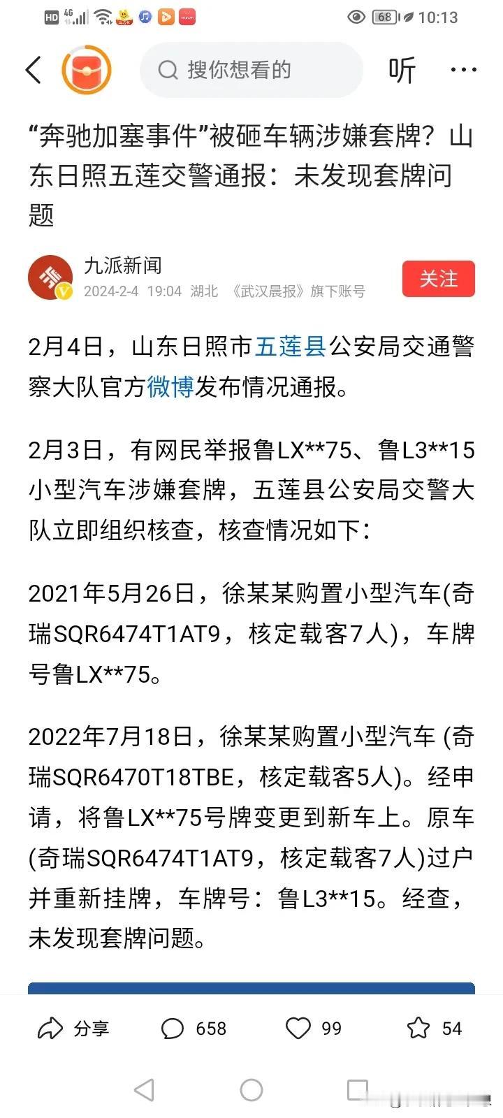 徐女士一家不仅背刺网友,还背刺媒体,最惨是徐闻公安、日照交警在年前被他们整到要为调查“奇瑞套牌”,“驾驶男曾酒驾吊销证件”等等这些事情上加班调查。 网友现在是扒出来一堆堆事情等着真相公布,包括踩油门顶奔驰男两次,是否涉嫌危险驾驶,故意伤人?驾驶男是否曾酒驾吊销证件?是否侵害奔驰男的肖像权? 唉,徐女士撒了一次谎,网友们都不相信了,利用流量炒作终会被反噬。 #评论区出主意大赛# #带着春联来拜年#