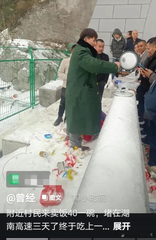 一位在湖南高速堵了3天的女士发了4张图片称:附近村民来卖饭,一碗40元,堵在高速3天了,终于吃上了一口热饭。网友称:知道从昨天开始常德下雪地区的白菜价格不,10块一斤,卖你40一个饭你就偷笑吧。 其实如果在高铁上,还是预制菜,根本没人喷。 这是特殊,天寒地冻,人家翻山越岭提上来很不容易,虽然也有些热心的村民又是免费的热水和饭,但不能道德绑架,毕竟人家还是要成本的,这样的天气,能吃上口热饭其实真的感激涕零。 大家觉得这样一碗饭40块钱,贵吗? #天南地北大拜年# #我来唠家常#