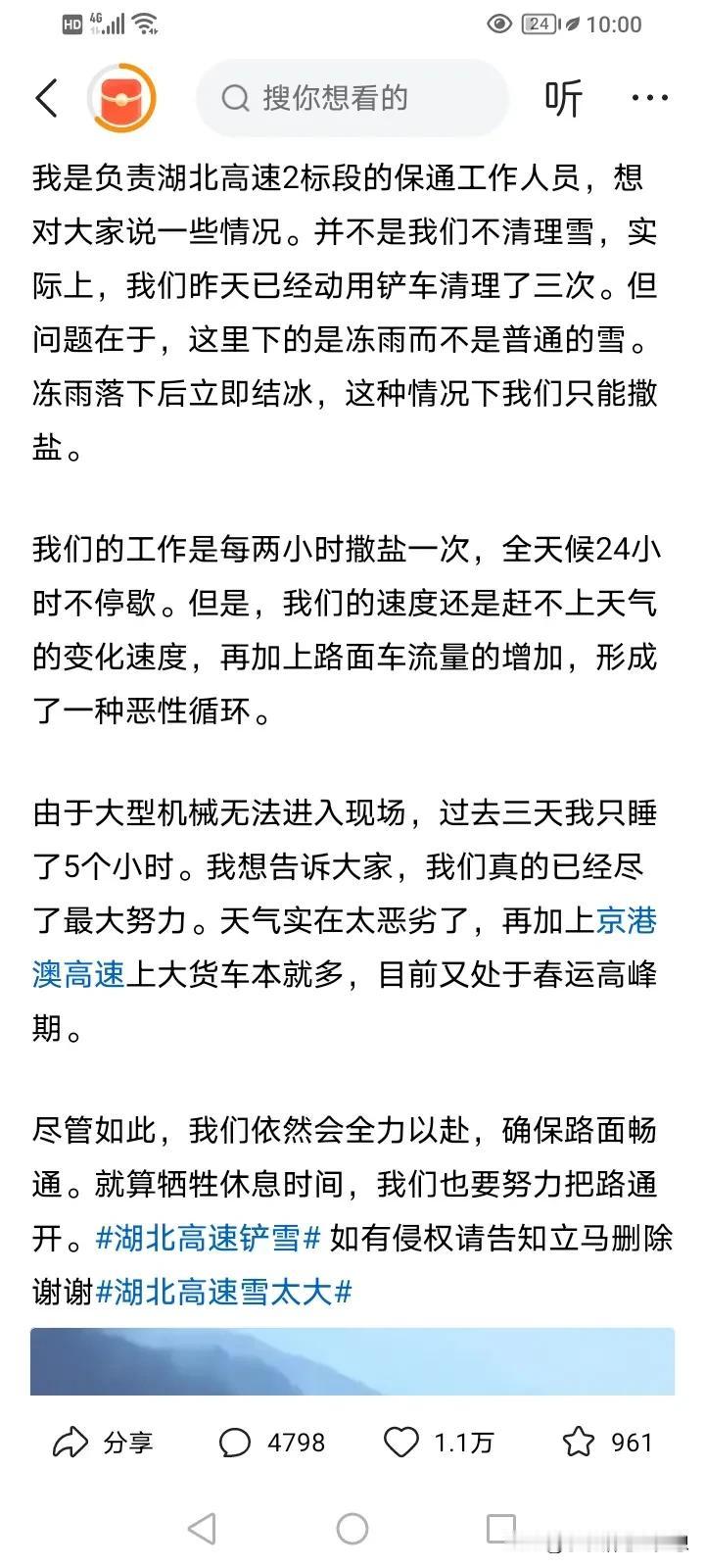 湖北这次积雪大塞车,网友在湖北高速等两天,来了河南救援队帮忙铲雪。湖北网友这两天一直强调不是湖北不作为,而是冻雨难弄 ,没法作为。 很多网友开始质疑:“湖北做不到的事,河南却做到了。” 网友说:这次确实是湖北反应太慢了,天气预报雨雪天气,他们没有引起足够重视,缺乏必要的应急措施和预案,是这次湖北高速出现雪天拥堵,服务没跟上的主要原因。 不是吹河南,河南的主干道、高架路两边每隔二十五米就摆好了成袋的融雪剂,雪一开始下就各方联动及时响应,提前撒盐,四辆 作业车一组,不分昼夜,只要结冰就立马清掉,机械和人工都一起上,根本不给结冰的机会。一晚上连下带刮,第二天早上出行并未受太大影响,而通过的司机也表示,河南路上真看不出雪,一路畅通。 我也看到湖北高速通保工作人员的发言,他们确实真的尽力了,面对网友们的一赞一踩,河南人是这样回复媒体的:“河南并不是要跟谁比,只是我们清清门口的雪,迎接游子回家而已。” 真为河南这次预案充分和响应积极点赞! 这样我想起了郑州720的那场水灾,湖北也奋力支援,这次是河南出手帮湖北了,这又让我看到了民族大团结,都是一家人,有困难一块解决,真好。 希望游子们安全到家。 #评论区出主意大赛# #记录我的2024#