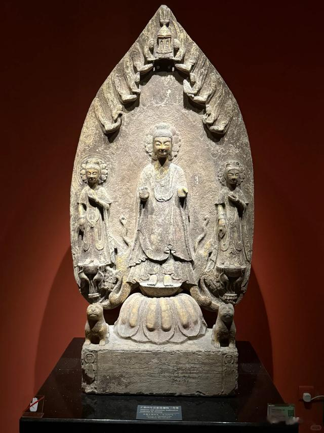 这尊背屏式佛三尊造像,整体保存十分完整。像下所设方座的正面有78字的刻铭,明确标明它是北魏正始四年公元507年由一位名叫法想的比丘尼发愿雕造的弥勒佛三尊像。这在目前所见的山东青州北朝造像中是时代最明确且最早的一尊;所雕造的弥勒佛形象也是中国目前所知时代最早的弥勒佛之一,与我们今天所见到的大肚弥勒佛有很大差别。