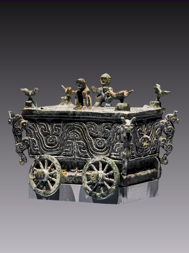 这件小巧精致的西周晚期铜盒,应是当时晋国贵族用于盛放贵重物品的器具,目前仅在山西曲沃、闻喜等地发现寥寥数例。 盒下安装四轮;盒身四角饰回首夔龙,四壁装饰波带纹,腹两侧各有一供牵引用的小环; 盖面四角各立一只昂首展翅、可任意转动的小鸟,中部为中间开合的两扇小门,小门分别以一人一猿为钮,人为蹲姿,猿为坐姿。 这件小盒虽形体不大,但造型特殊,设计新颖,特别是盖顶四只小鸟、底部四轮及两扇小门共10处可以自由转动,颇具巧思。