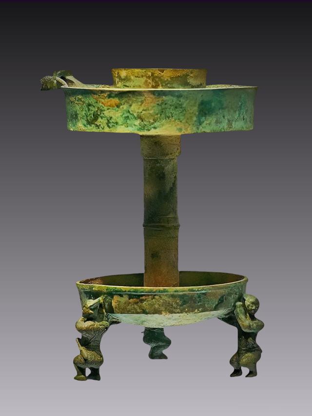 这件西汉铜灯,是中国已知唯一一件汉代两用灯。它的最上面是圆形灯盘,灯盘内心安放一个蜡烛纤,可以插放蜡烛。外圈则是油灯,外壁上设置一个龙首形的小流嘴,浸泡在油里的灯捻通过龙口伸出,点燃后就成了油灯。