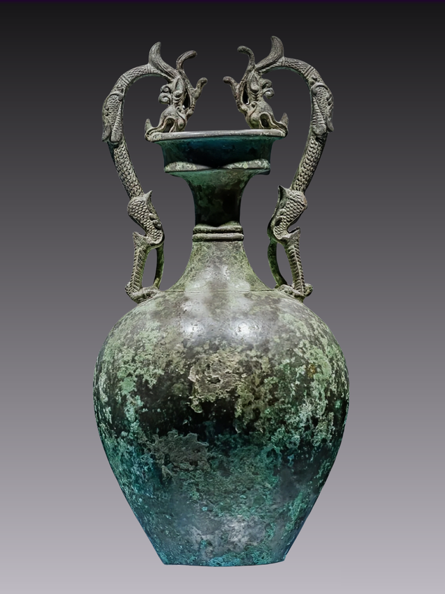 这件唐代铜壶具有鲜明的中亚、西亚一带的艺术风格,应当是中国工匠向古波斯即今伊朗一带的艺术家们学习的结果。它造型修长而优美。壶自肩部至器口有一对双龙耳,它们的身躯呈S形,正垫起脚尖伸着头向壶内,似乎正要饮壶内的琼浆玉液,生动活泼。目前所见的双龙耳盘口壶多是瓷器和唐三彩制品,青铜制品则极为罕见。