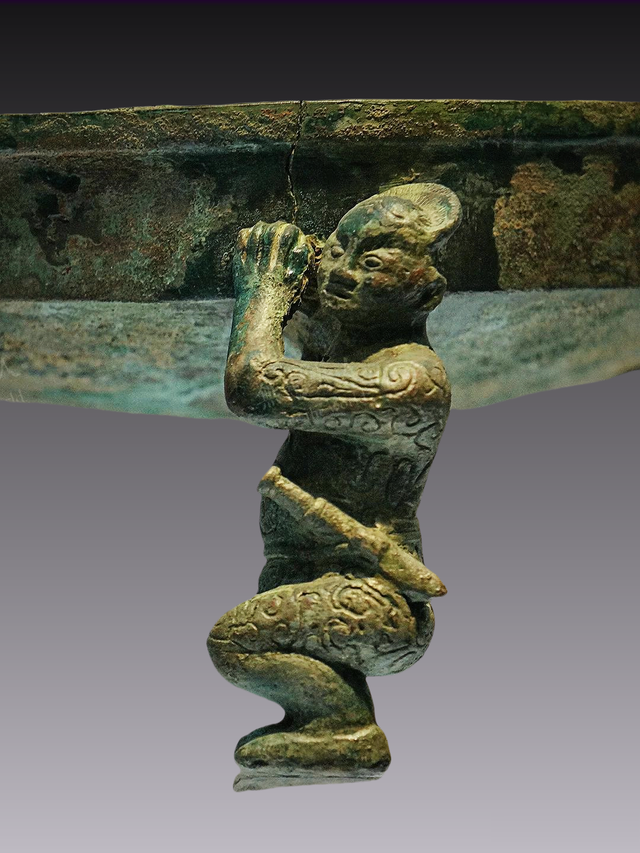这件铜灯以底座下的三位擎盘小人最具艺术性。他们屈体下蹲,作双手用力向上擎举状,十分生动。三人皆扁平脸,头发向上盘起形成发髻,身上仅穿一条“丁”字形短裤,身体表面呈现大面积文身图案,形像极似今天日本相扑选手。这是日本国技相扑源自中国的重要实物证据之一。