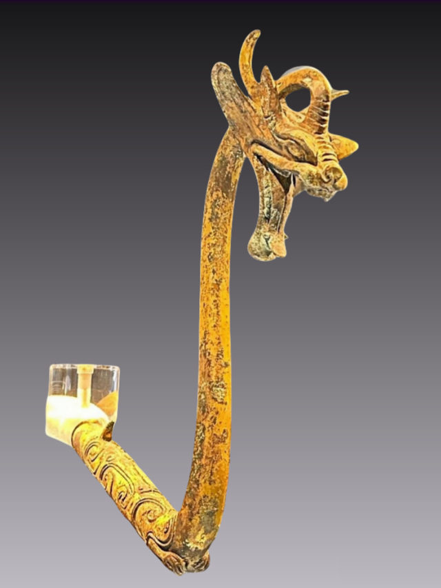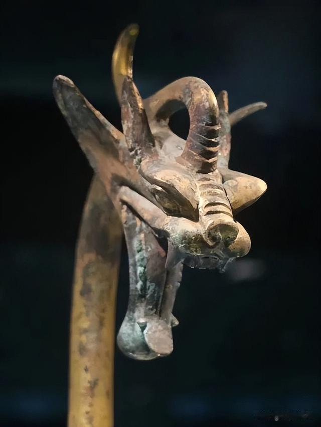 这件西汉早期的器物是古代伞盖或帐构的弓帽,通体作呈“S”形的龙形,龙体中空,可套插伞骨;龙身上面设一倒钩,用来勾挂用作伞面的织物。它通体鎏金,色泽华美,而且龙的雕塑手法极为精到,龙昂身上扬作飞翔状,双角斜立,两眼圆瞪,大口暴张,牙齿锋利,凶猛异常,就像是一条正在准备出击的眼镜王蛇!