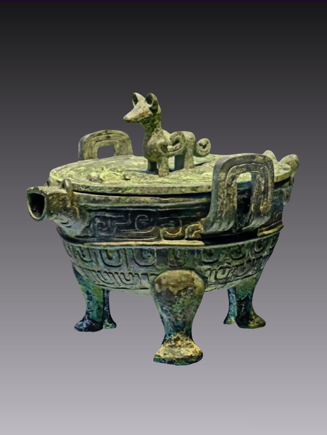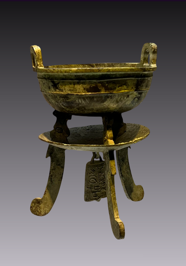 西周中期,是目前非常少见的鼎形温食器,其鼎腹之下设为圆形托盘,可加炭火温热小鼎中的食物,类似作品仅在陕西宝鸡茹家庄等地有所出土。 更为特殊的是,托盘之下还有一铃,铃上饰细阳线的兽面纹。以往曾在簋、尊等类铜器上发现有底部置铃的现象,鼎下置铃尚属首次发现。 鼎内底有三字铭文“贤作宝”,标明其为西周贵族贤所作。