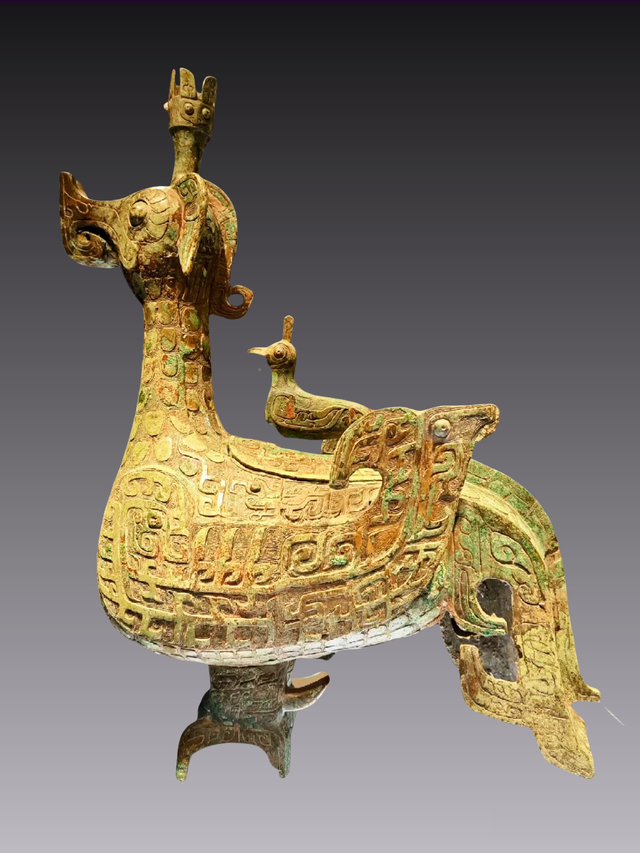这件西周早期凤鸟尊,尊盖内侧有2行8字铭文:“倗季乍祖考宝尊彝”,明确标明其为商周时期有名的倗氏家族某位成员所作的青铜礼器。 尊通高50厘米,胎体厚重,质地精良,保存极佳。通体表现一只昂首挺立的凤鸟形象,头顶花蕾状高冠,勾喙前伸,长尾披垂。凤鸟的背部设置圆拱形器盖,盖上挺立一只小凤鸟,一幅神情怡然的样子。大小凤鸟通身均装饰鳞状羽纹等纹样,繁复而美观。