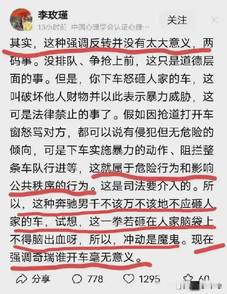 著名心理学家李玫瑾被网友们骂到删帖子了并跑到南海“避风头”了,奔驰车怒砸奇瑞引擎盖事,网友认为徐老太太故意隐瞒事实,恶意剪辑视频,煽动情绪,还背刺媒体应该受到谴责和追责。 李玫瑾教授因为这件事情也发表了自己的想法,她说这种强调反转根本就没多大的意义义,奔驰男挡事砸车这种是属于危险行为和影响公共秩序的行为。 如果这一拳要是砸到人家脑袋上,不得是出血啊?所以强调是谁开车根本就没有意义! 我突然间想起了一句话:“一个更高级的哲人独处着,不是因为他喜欢孤独,而是在他的身边找不到同类。” 如果没记错的话,她对之前巜繁花》这部电视剧吐槽也被网友骂的不行,最后也删了帖子。不过她非常善于反省,最后,也把网友的话听了进去。 其实现在全网不是说奔驰男能够反转,他还能反转吗?都已经刑拘了,其实网友们都清楚,也没有人说奔驰男的行为是对,现在网友追究的是另外一件事情。 网友们讨论和讨厌的是这对母女的行为,他们为了流量谋取利益,恶意剪辑视频炒作。第一回我妈开的。 第二回我从没说过我妈开车。 当记者揭穿他们说谎的时候。 第三回我说的不算。 第四回谁开的不重要! 而且李教授这种假设也是激起网友的气愤,如果是假设,那白车的那一脚油门真的把奔驰男给撞了呢?这种踩油门撞人的行为是否也属于危险行为和违反公共秩序? 估计她也应该看了网友们的评论,或许对这件事情也有一些改观了吧,要不也不会把帖子删。 其实凡事都讲因果。大家都是觉得徐老太太作为公众人物不应该以博流量谋取利益为前提欺骗大家,网红在获取更高社会地位的时候,更应承担社会责任。 #评论区出主意大赛# #我来唠家常#