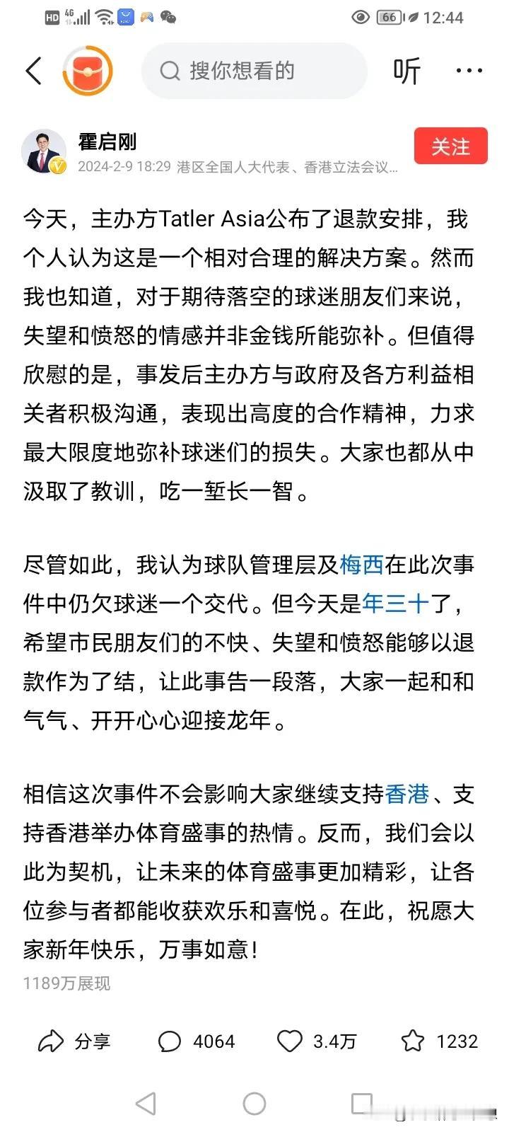 梅西这次真的是玩大!看看香港人是有多恨他傲慢和不尊重的行为,我也认为上场与否不是多么严重的问题,他对国人的不尊重才是让人无法接受的,黑着脸,双手插着兜一副傲慢的表情,无视球迷的存在,甚至不道歉,不主动退款,这刚好和三天后出现在日本的表情形成了巨大的反差。真的不能怪香港人排挤他了! #我来唠家常##天南地北大拜年#