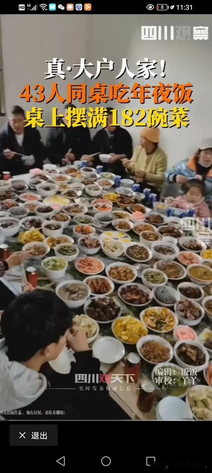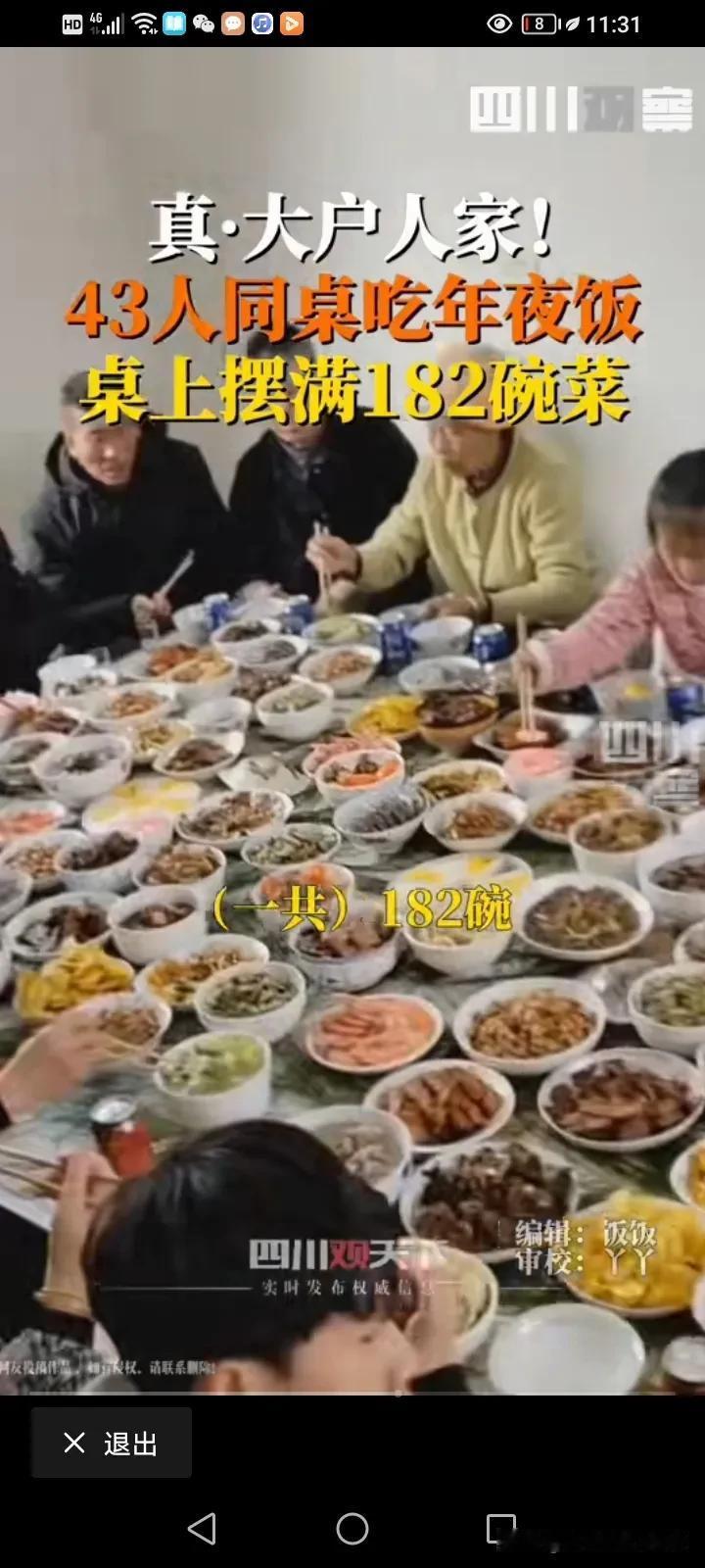 被网友晒出的年夜饭惊呆了!这是云南的一大户人家年夜饭的图片,43个人,182碗菜,很认真的数了几遍,一共就28个菜,其中14个菜分了六碗,14个菜分了七碗,暂停了几次,才数清楚! 这样的年夜饭,我看了真的觉得不可思议,182碗,43个人吃,平均每个人得分4.2碗多,这其中还有小孩和老人,这怎么吃得完啊? 张先生说,他们家一共78人,这一次吃年夜饭只有43人。 这样吃年夜饭确实是挺热闹,这应该是四代同堂,热闹归热闹,但想想这桌菜的后面的故事,看着都累,采购累,做的累,吃的累,可能从早上忙到晚上吧,还能吃到热菜吗?中间的菜是摆设吗?还能夹到吗? #我来唠家常# #天南地北大拜年#