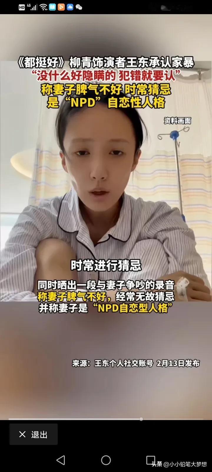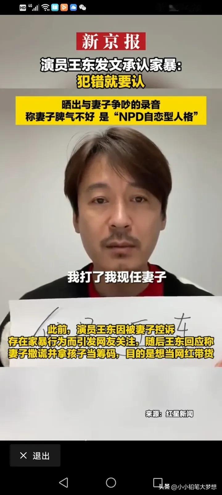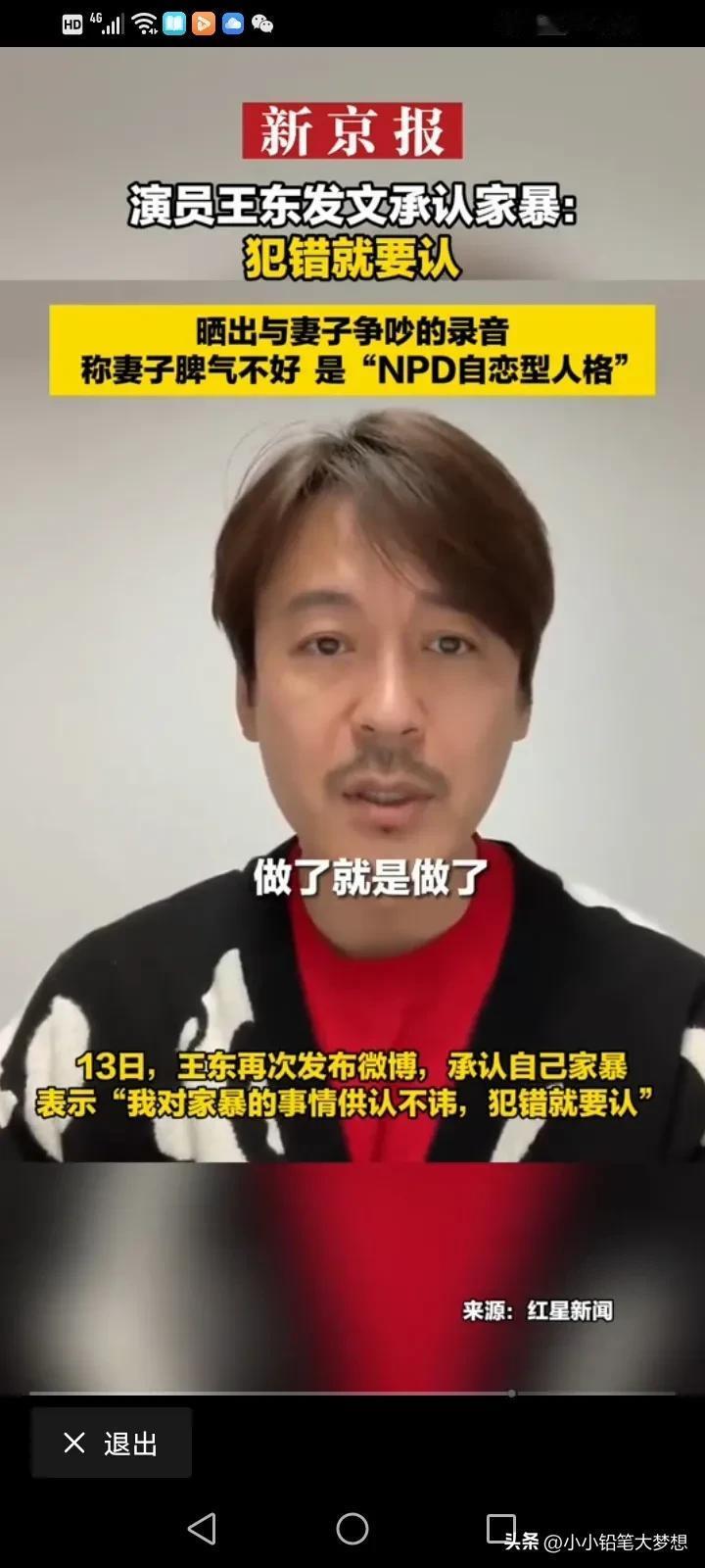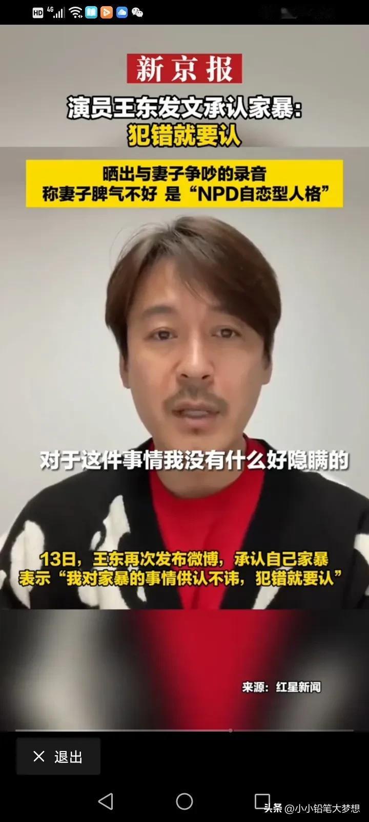 《都挺好》柳青饰演者,演员王东承认家暴!他回应:“我承认我是家暴男,做了就是做了,没什么隐瞒,但是我那妻子脾气不好,时常对我进行猜忌,我一直尽量选择避免冲突!” 之前演员王东的妻子称被王东打得遍体鳞伤,妻女二人被逼在救助站过年。 汪东的妻子还晒出过自己整个手臂被咬黑的图片,并称其实并不是简单的家暴,而是蓄谋已久的人性最丑恶的陷害。 王东家暴事件被曝光后,视频也被曝光,王东一个飞腿就踢向他的老婆,我看了之后觉得也真的是太狠,但是他解释说自己之所以这么做,是因为妻子的脾气太差了,经常猜忌,是“NPD自恋型人格”。 真的清官难断家务事,看到女的控诉,我觉得男的有问题,看到男的控诉,觉得有的女人无休止的升级家庭矛盾,如果真的触犯了自己的父母,触犯了他的底线,会把男人逼疯的,有的时候真的是一个巴掌拍不响,但是我只想说,家暴只有零次和无数次,如果真的过不下去,那就离了吧,没必要把她打的那样子。 公众人物应该有道德底线和责任感,不要成为家暴的遮羞布。妇联也该出手了,希望有真相,家暴了那接受应有的处罚,家暴原因也要了解清楚,看双方之间孰是孰非! #我来唠家常# #记录我的2024#