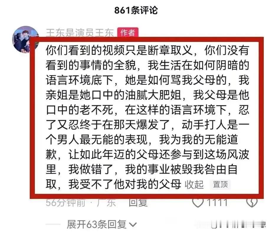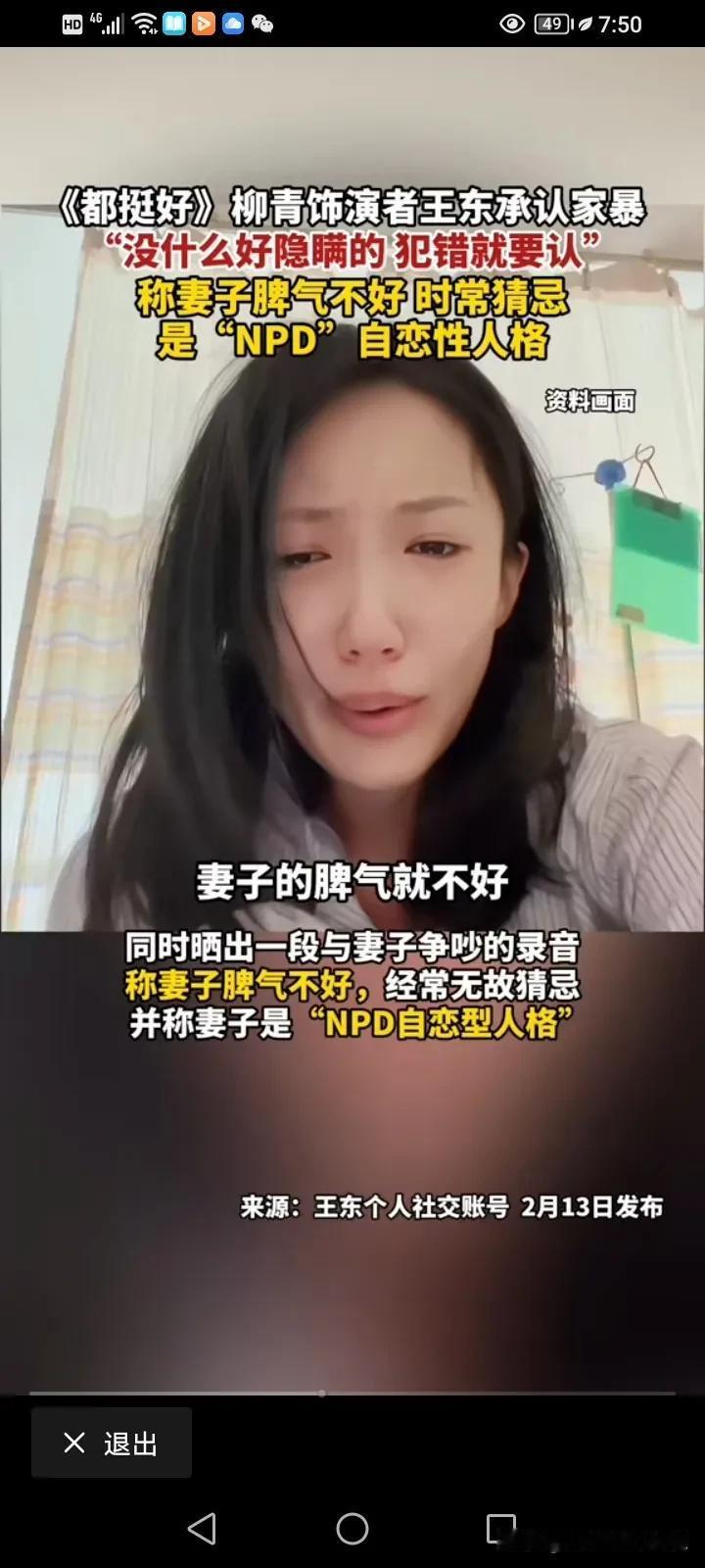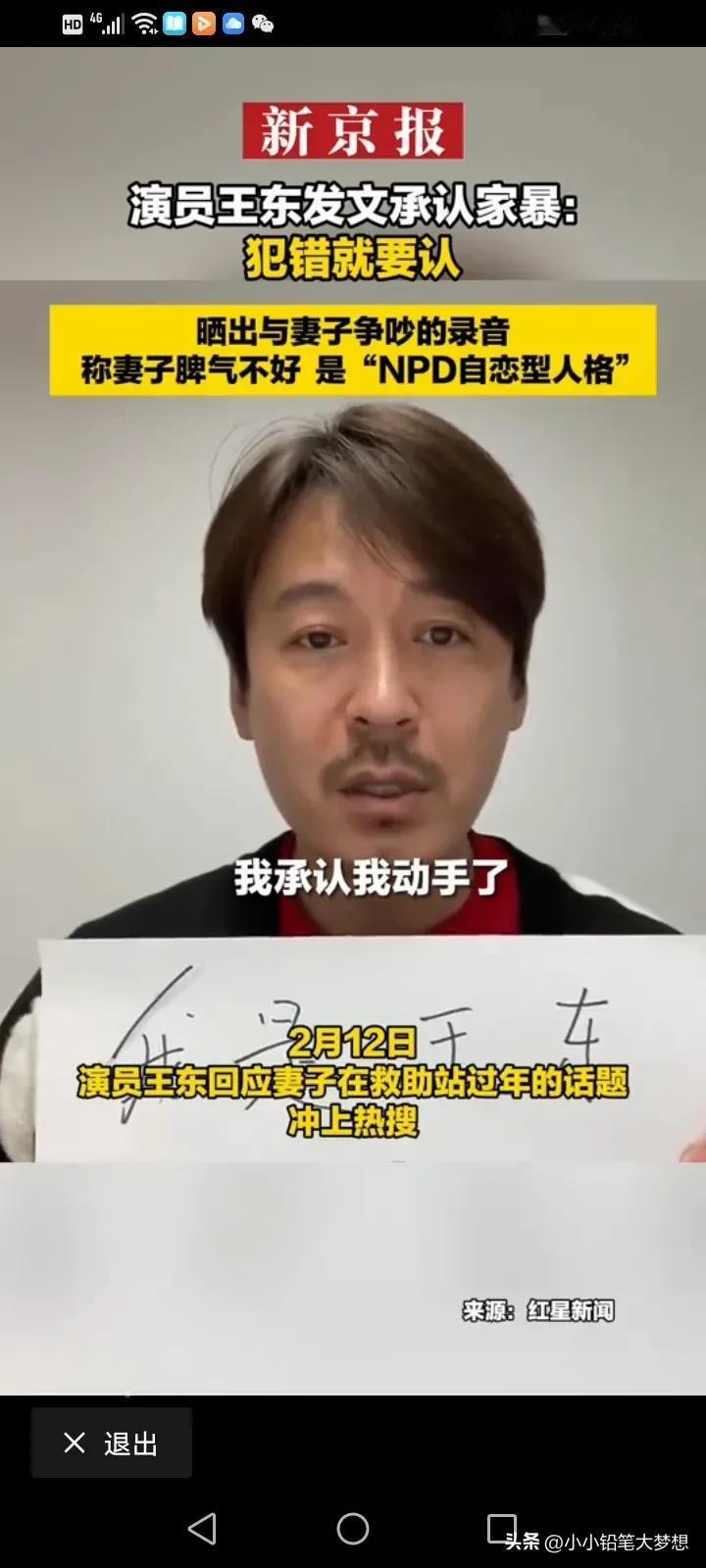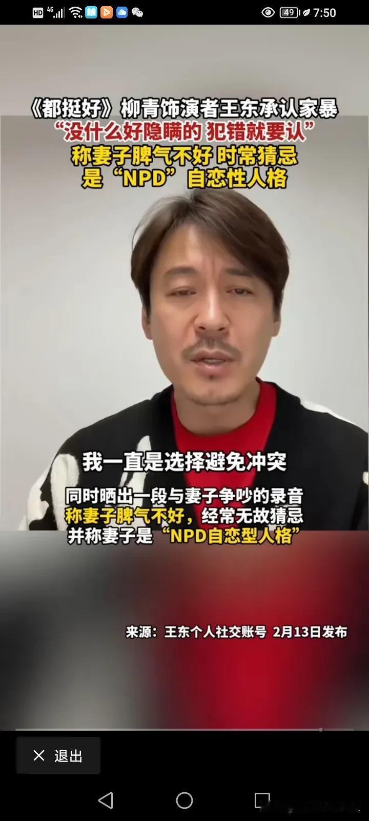 《都挺好》柳青饰演者,演员王东承认家暴!他回应:“我承认我是家暴男,做了就是做了,没什么隐瞒,但是我那妻子脾气不好,时常对我进行猜忌,我一直尽量选择避免冲突!” 之前演员王东的妻子称被王东打得遍体鳞伤,妻女二人被逼在救助站过年。 汪东的妻子还晒出过自己整个手臂被咬黑的图片,并称其实并不是简单的家暴,而是蓄谋已久的人性最丑恶的陷害。 王东家暴事件被曝光后,视频也被曝光,王东一个飞腿就踢向他的老婆,我看了之后觉得也真的是太狠,但是他解释说自己之所以这么做,是因为妻子的脾气太差了,经常猜忌,是“NPD自恋型人格”。 真的清官难断家务事,看到女的控诉,我觉得男的有问题,看到男的控诉,觉得有的女人无休止的升级家庭矛盾,如果真的触犯了自己的父母,触犯了他的底线,会把男人逼疯的,有的时候真的是一个巴掌拍不响,但是我只想说,家暴只有零次和无数次,如果真的过不下去,那就离了吧,没必要把她打的那样子。 公众人物应该有道德底线和责任感,不要成为家暴的遮羞布。妇联也该出手了,希望有真相,家暴了那接受应有的处罚,家暴原因也要了解清楚,看双方之间孰是孰非! #我来唠家常# #记录我的2024#