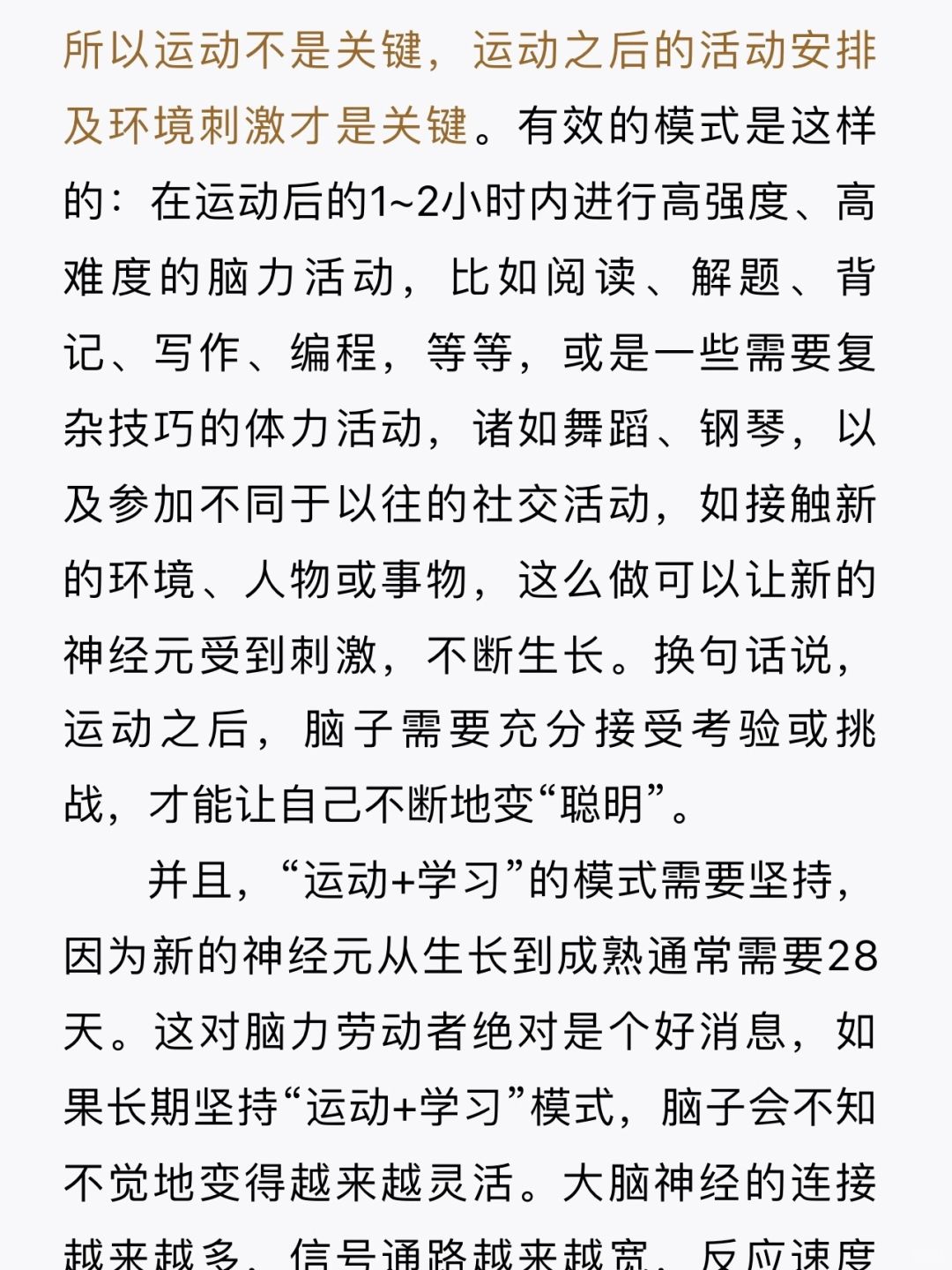 先运动再学习,专注力会更强🧠 科学研究,运动能使大脑长出新的神经元,新生的神经元需要经过发育才能存活。运动过后开始学习能够有效地使新生神经元发育。