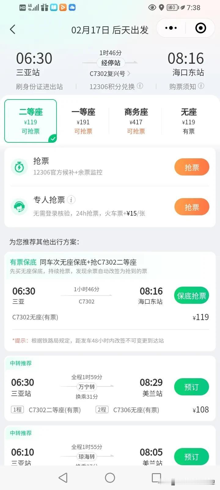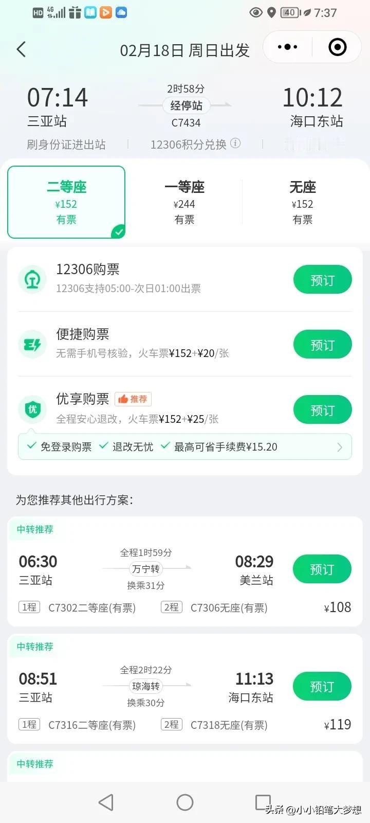 我有一个最省钱,快速离开三亚的方法,2019年的时候我也遇到现在这样情况易入难出。我就是用这种方法轻松出岛,首先网友说买一部二手车,然后再开回来,这个方法是不妥的,先不说手续麻烦吧,又买又卖的,首先,方法就不对,行不通的,因为徐闻港的通行能力真的很有限,现在滞留的车辆非常多,预约的车都要等3~4天才能过海。 有一些人说那就坐高铁走吧,别说高铁了,火车都没有啊,十天以内的票全部售空了! 我的方法是这样的,在三亚随便找一辆高铁坐到海口东站,C7328、C7402、C7452、C7434、C7404、C7432、C7302等任何一辆都行,无票就可以了,因为时间并不是太长! 到了海口东站,找一部网约车,让他给你送出海口新海港码头。费用并不高,最高也就70多块钱。 在码头乘坐ZX40340轮渡到徐闻,到了徐闻就等于出岛了,然后再坐大巴到湛江,到达了湛江那交通就畅通无阻了,可以坐高铁回去,也可以到吴川飞机场坐飞机回家。 现在的飞机票这么贵,是因为都是商务舱,经济舱早就卖没了,所以飞机票差不多上万,甚至近两万,如果一家五口六口的话,那就真的是十几万,那不妨真的是请几天假,十几万,我想说就算再富裕的家庭也会肉疼的,那不妨呆几天吧,把这几天的高峰期度过了之后,我想飞机票肯定会回落了,火车,高铁,通通都可以实行了。 酒店就不要去住了,在元宵之前肯定都不会降价的,可以找那种月租房或者是短租房,那种会比较合理一些。 还有我想说,海南的文旅局,这一局做的真的是绝了!这真的是中捉鳖呀!关门打狗,偏偏这个时候他还维修机位,这一点真的令我很不解,其实我觉得真的没必要一窝蜂的涌去三亚,每年不是酒店涨价,就是飞机票涨价,每一年徐闻港都会塞,进出两难,而且海南的物价一点都不便宜,宰客的现象屡见不鲜。 如果想要去热一点的地方,新马泰都免签呢,价格也不贵,广西,广东很多地方也很好,也特别漂亮,不是只有三亚的海才是最美的,惠州,茂名,电白,阳江,徐闻都有海。 #我来唠家常# #2024春节返乡大作战#