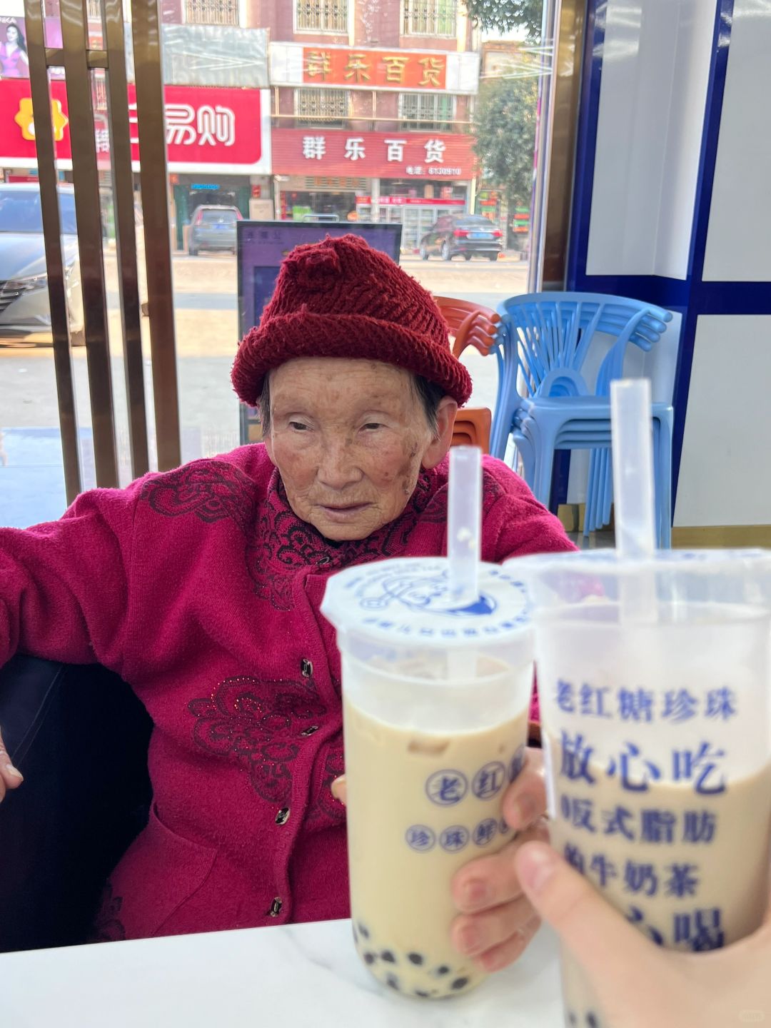 10元就能让奶奶开心一天 每次在家和妹妹们点奶茶的时候,奶奶总是说不喝不喝,加上奶奶年纪较大不敢让她喝太多奶茶,但每次我们忙喝完的奶奶总会拿起来喝,其实奶奶也是个小朋友怎么会不喜欢喝奶茶呢。 每次放假回家陪奶奶都是在家里看电视,今天想无聊也是无聊,倒不如带奶奶出去喝奶茶,一杯简单的珍珠奶茶,奶奶喝的津津有味所以其实不一定非得要大富大贵才能陪伴家人,只要我们在陪他们,哪怕一杯简单的奶茶,他们都能很开心🥳 陪伴是最长情的告白,如果你看到这里,记得多陪一下家人噢