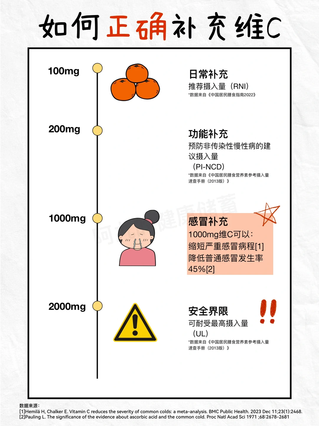[向右R]2023年有一份荟萃分析指出:1000mg维C可缩短严重感冒病程,使感冒严重程度降低。这也验证了1000mg维C能够有效提升机体的抵抗力