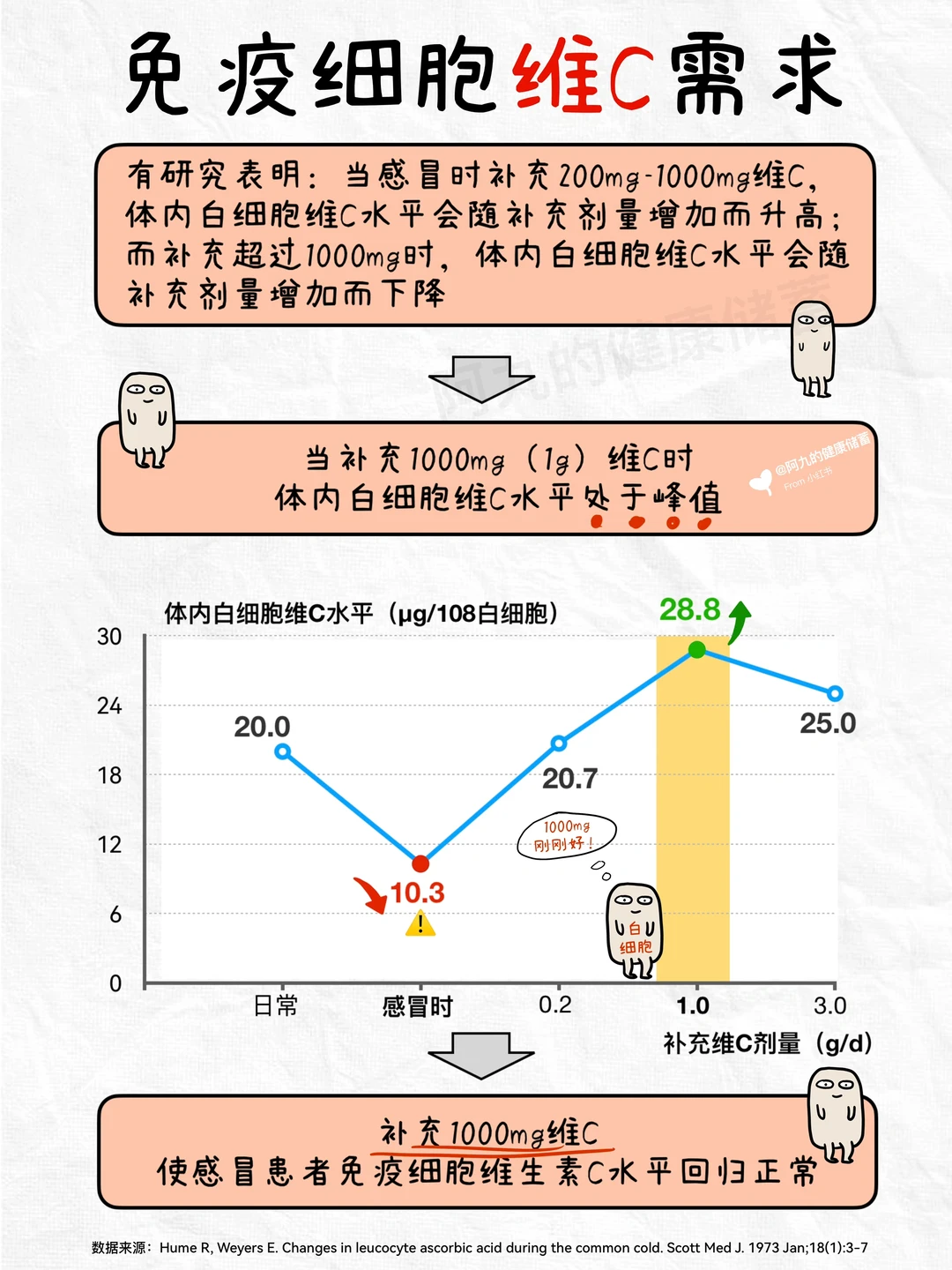 有研究表明,人体内白细胞维生素C水平会在感冒的第一天下降50%,此时补充大量维C有助于白细胞内的维C水平快速恢复,但是当维C摄入量超过1000mg时,免疫细胞维C含量反而会随着摄入剂量的升高而下降。