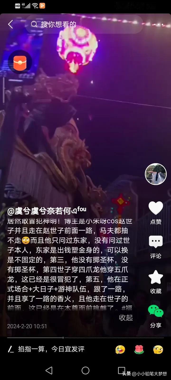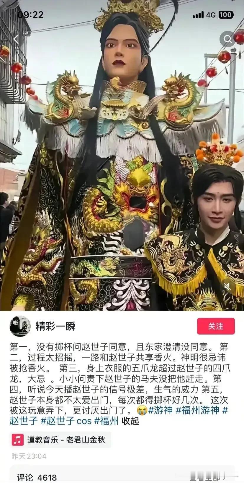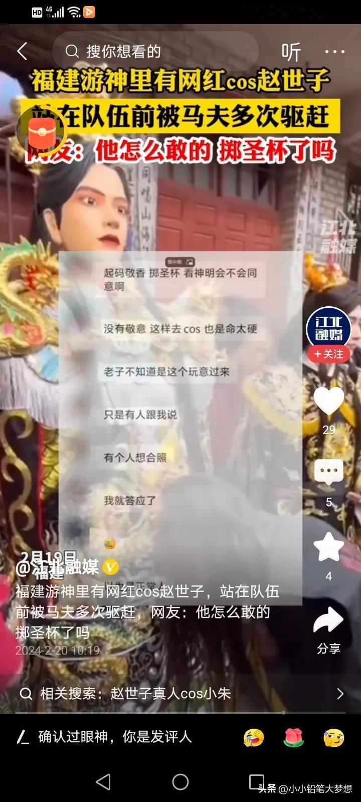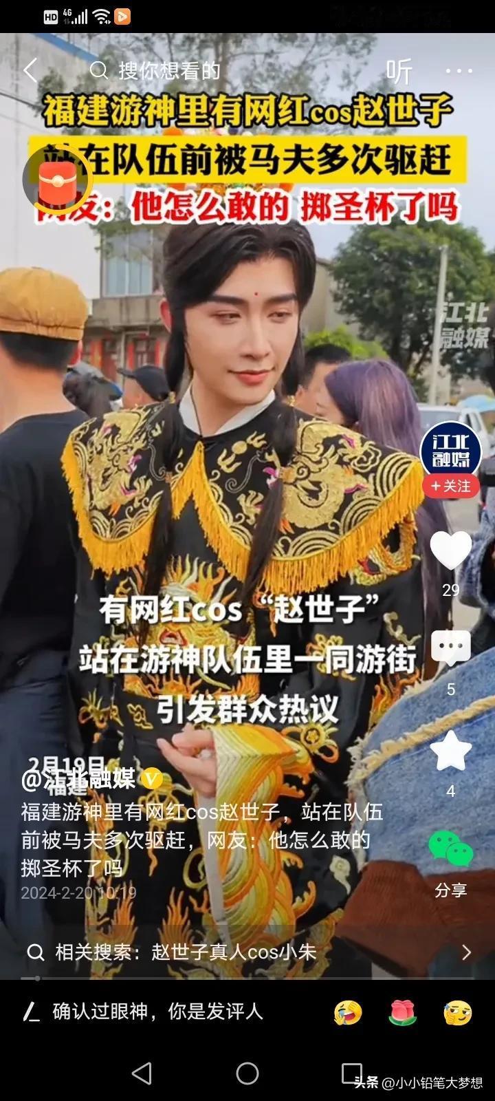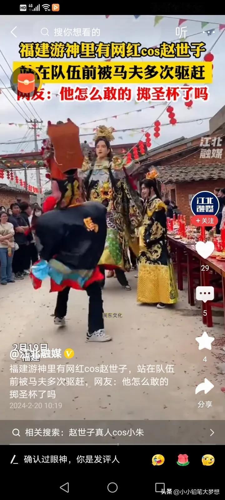 闹大了!网红COS福建游神赵世子引发众怒,真的要管管这些网红,为了流量,什么都往上凑,他之所以被整个福建人唾骂,是因为真的是冒犯了,福建对于这些非遗文化和信仰真的十分重视的,每个地方都有每个地方的信仰,你可以不信,但你真的不能不尊重,而且拿它来博流量! 刘涛COS妈祖,之所以没有一个人骂她,是因为她提前掷圣杯,并征得“同意”才去饰演的。 而这个网红明明没有得到东家的同意,却说自己得到同意了,而且旁边的人一直喊他走开,马夫也一直在驱赶他,他还若无其事的厚着脸皮走在了最前面,这才激起民愤的。 #寻找家乡龙年味道# #记录我的2024#
