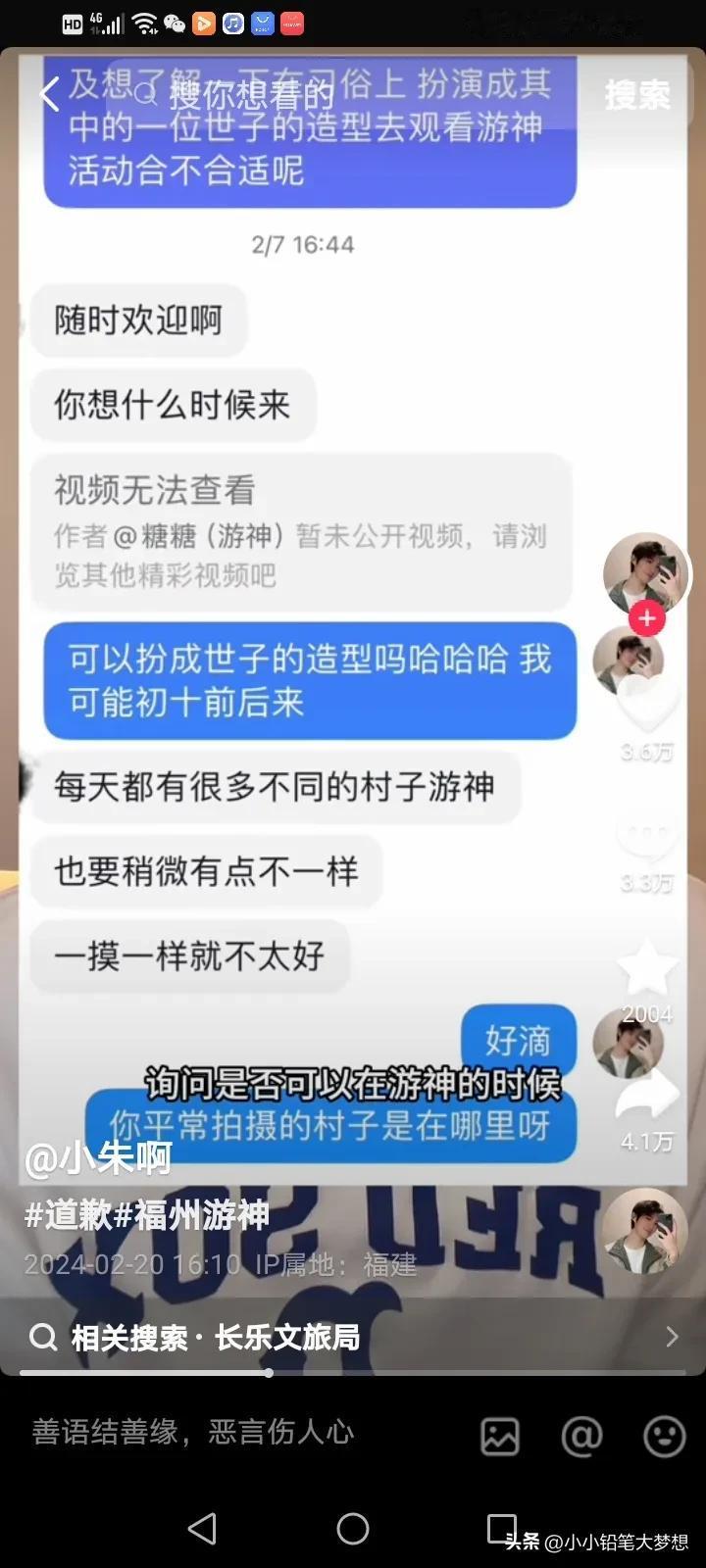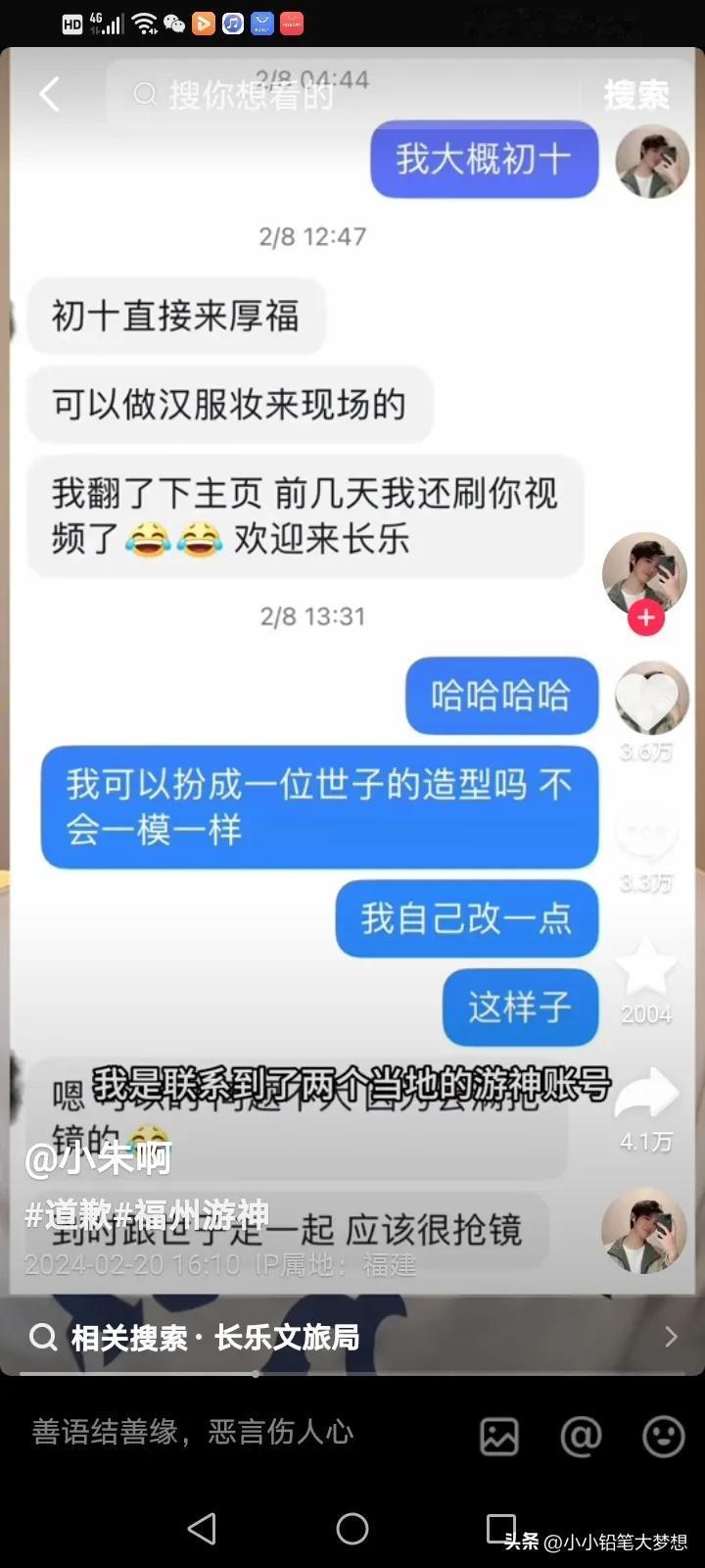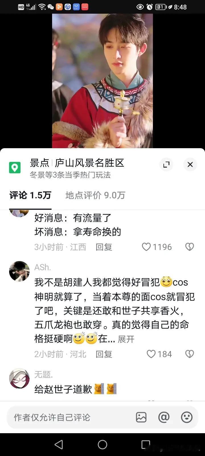 Cos赵世子的网红终于道歉,但是他还是玩了文字游戏,他说已经到了英武庙,求得了神灵的的愿谅,但实际上,视频中的他没有跪下来去扔圣杯,而且只扔了一次,他说自己是联系了两个神游的账号,得到了对方的应允,但实际上是东家:汉服妆 他:直接cos世子,而且服装上的龙压着世子的。 东家:队伍旁边 ,他:最前面! 而且他还说接受了文旅局的邀请,人家文旅局出来澄清,根本就没有邀请什么网红。 现在他的评论区开炸了。 #我来唠家常#