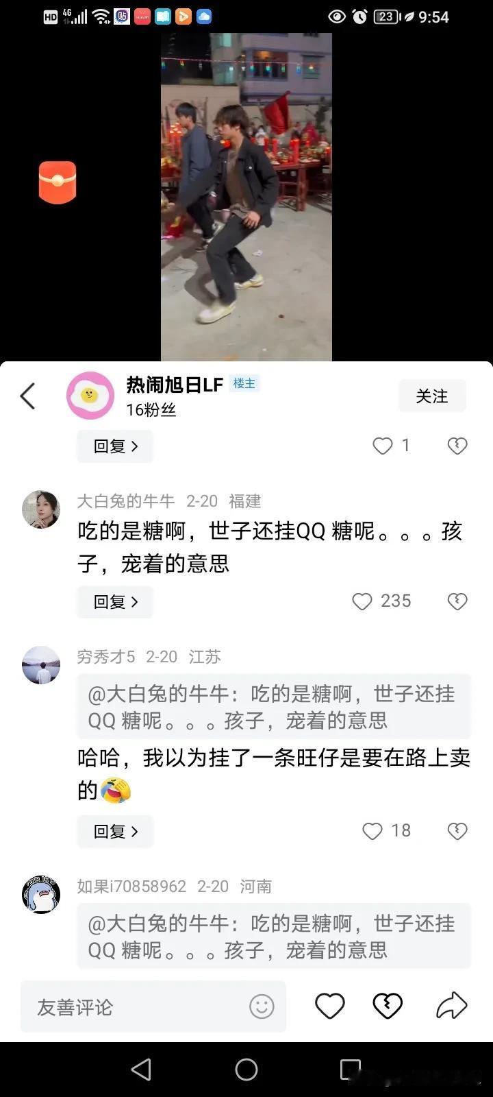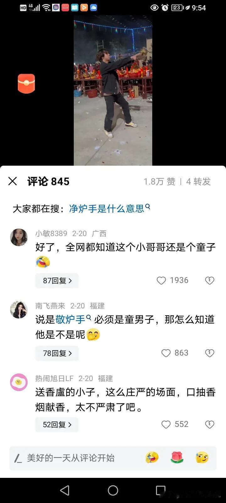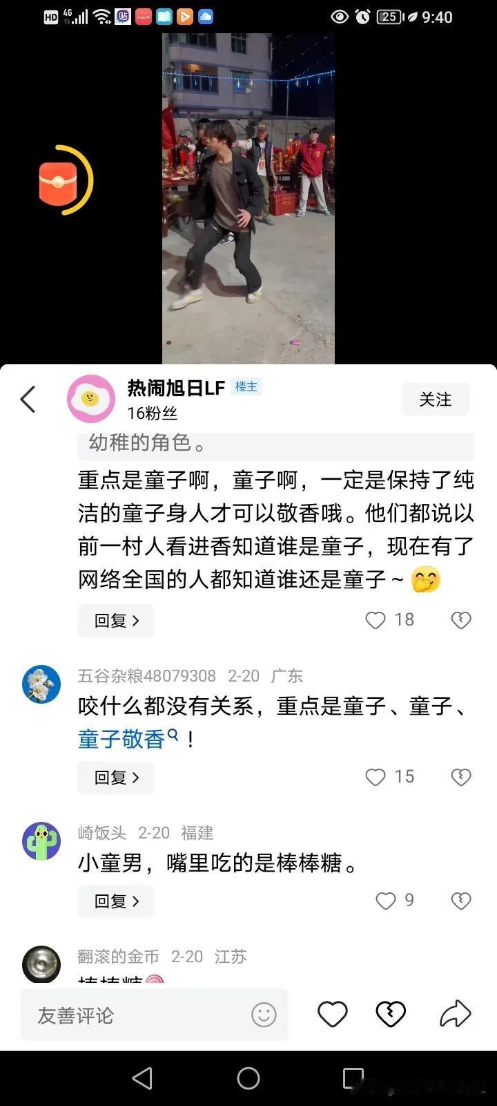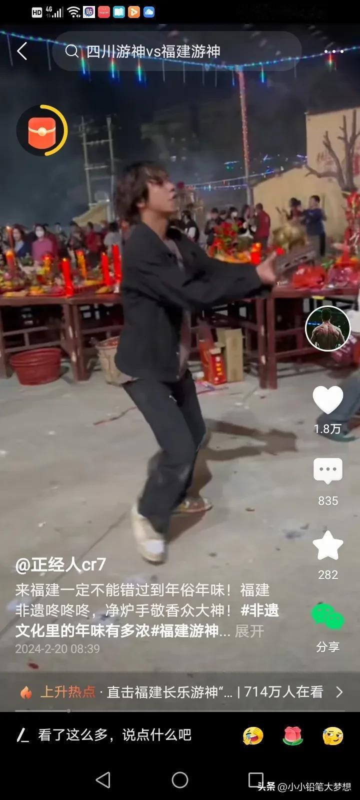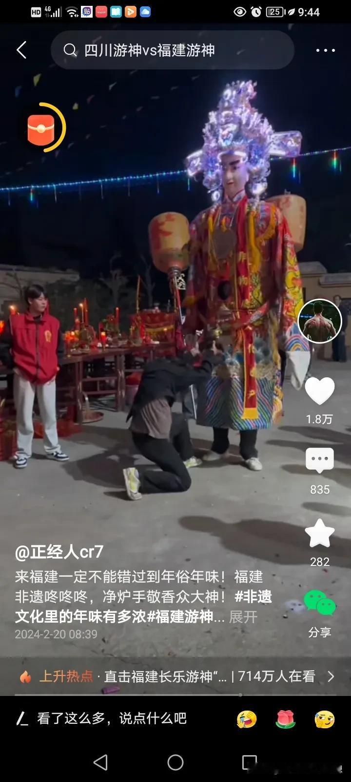 看了福建的游神,真是长见识了!一开始我就看着这个年轻人手捧香炉,嘴叼着烟去敬神,第一感觉就不太好,但是网友却点醒了我! 网友说,这根本不是烟,是棒棒糖,仔细一看,还真是,而且这个男孩是净炉手,这个净炉手是很讲究的,必须是童子! 而这个棒棒糖,原来是给他们提供能量的,因为游神又蹦又跳的,要消耗太多的体力。 而福建所有村庄的游神活动都要净炉手激活神灵后,然后才开始走动接受四方的香火,而整个过程都会鞭炮炸街,十分的严肃。 而世子身上通风口的位置,还挂着QQ糖,网友的解释说这是,孩子,宠着的意思…… 福建这一次听说是请了400位神出来,据说还有一些不愿意出来玩的…… 突然觉得好有意思啊,看来明年要去现场感受感受了这种非遗活动了。 #寻找家乡龙年味道# #记录我的2024#
