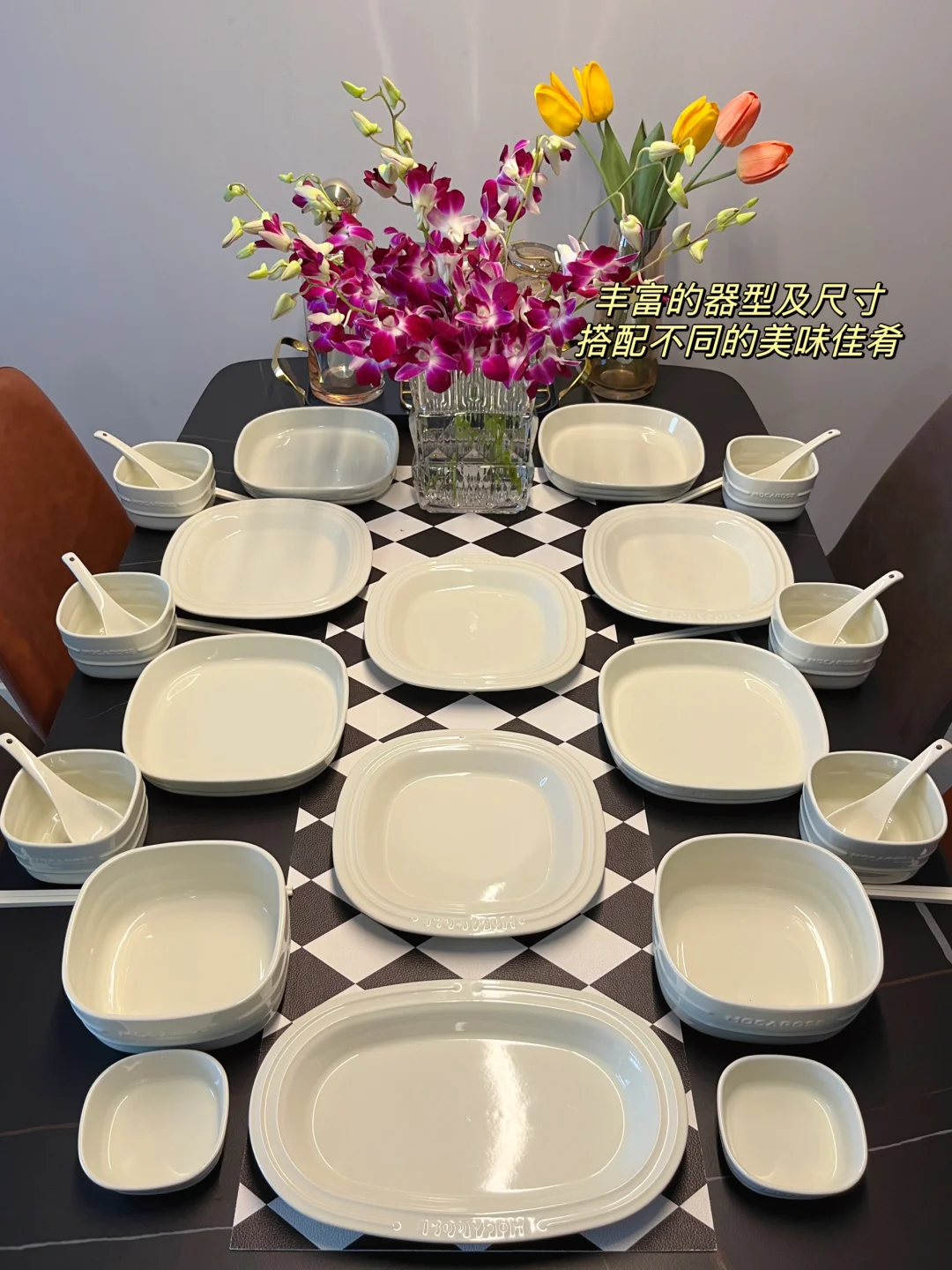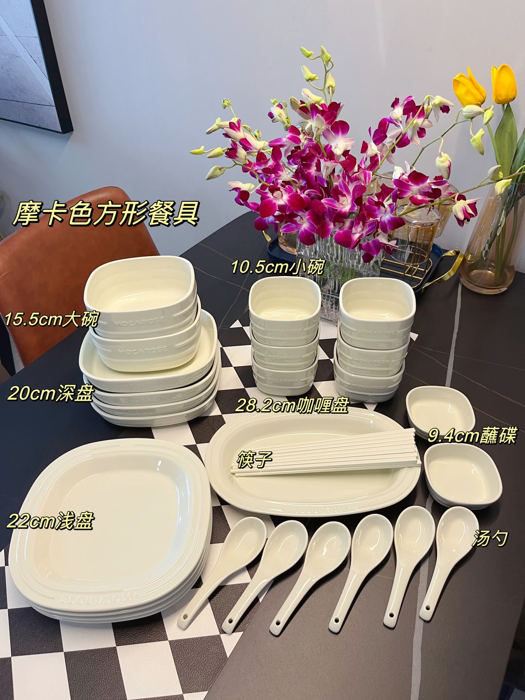 收到了年后的一套新餐具,可能家里圆盘太多了,这套摩卡色方形餐具好特别~方中带圆,尽可能增大装菜空间,浅盘装带汤汁的菜系也不容易撒出。奶油白的颜色简约大方,一如既往的厚实有光泽,而且进微波炉、蒸烤箱、洗碗机都没问题哈👌🏻