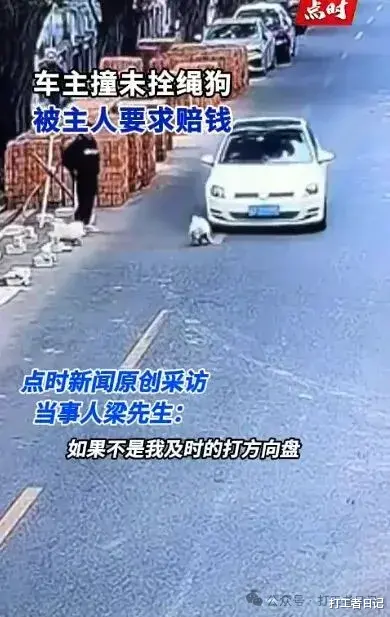 近日有位网友梁先生分享了一个关于开车撞到狗的事故,今年一月份他开车途中遇到一只没有牵绳的狗突然跑了出来,结果避让不及车头右上角撞到了狗。