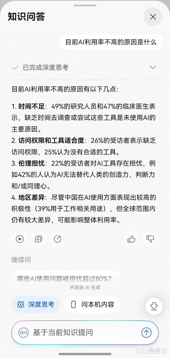 小艺知识库还能提供基于个人知识的AI问答,这是我作为创作者非常需要的。假设我现在想到了新的选题角度,但是对某个观点有存疑,就可以向小艺知识库提问。比如写到某人群AI利用率不高,我可以问,“目前AI利用率不高的原因是什么”。小艺能立刻基于资料给我解答。
