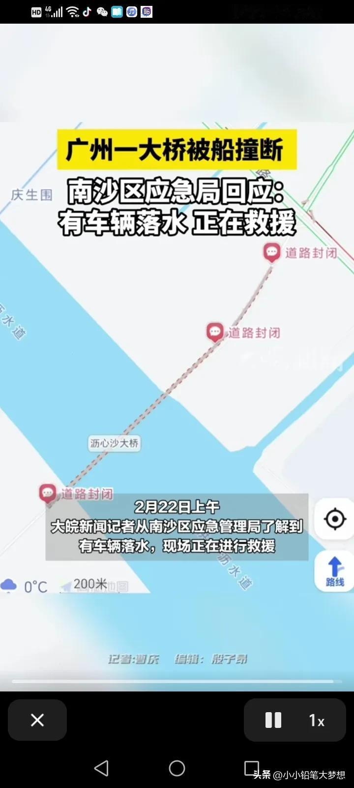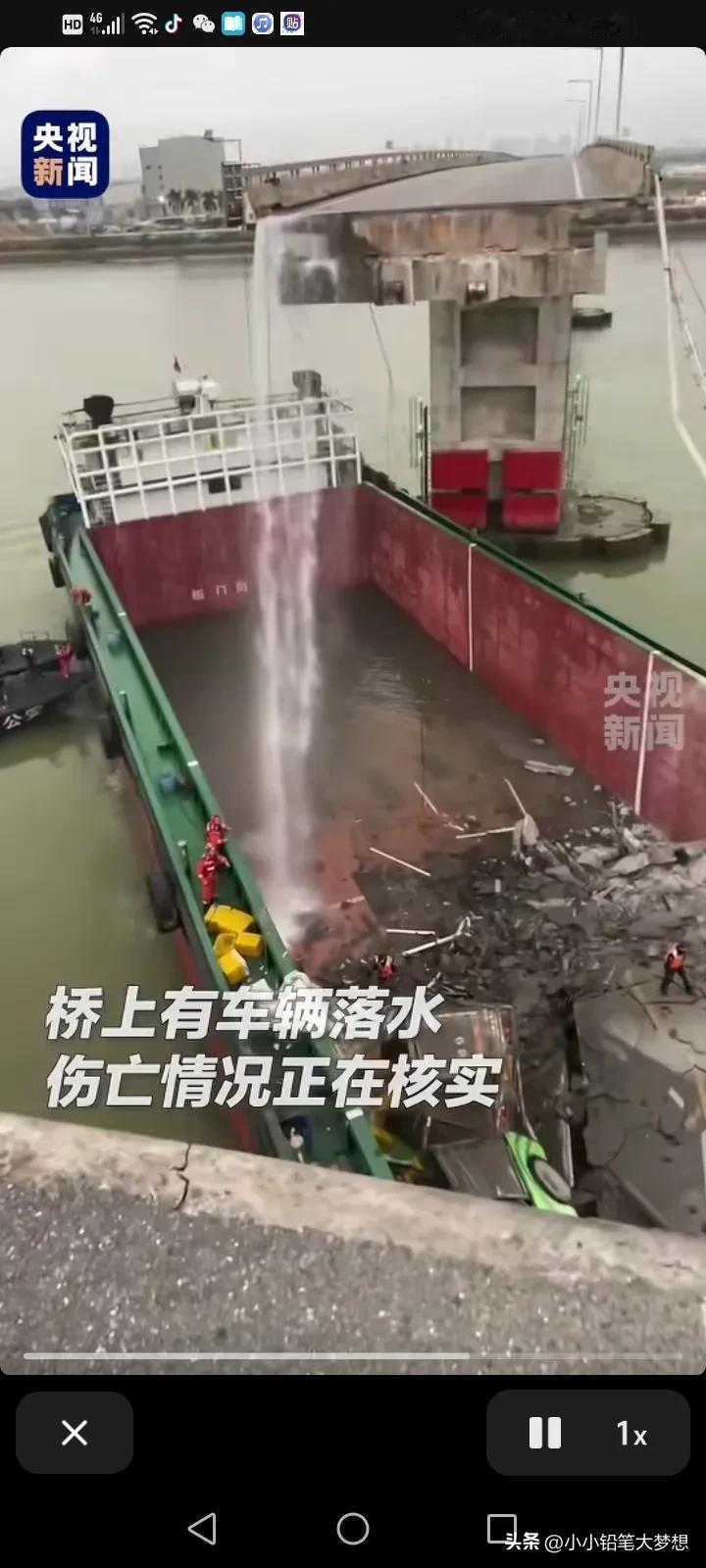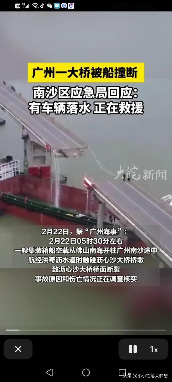 惨了,广州市南沙区万顷沙的沥心沙大桥被大船撞断了,多辆车掉了下去,现在知道的是有一辆绿色的公交车,还有两辆电动车。 一位知情人表示,他说自己的妹夫和妹妹都被困在岛上,现在这里也实行了交通管制。 因为是事发在今天凌晨五点30分,所以公交车上只有司机一人,这是万幸的,因为当时车流量并不多,具体掉落多少车辆,人员伤亡多少?现在还没有出具体数据,现场人员在紧急救援。 这是一艘空载的集装箱船,从佛山南海开往广州南沙,途中航行洪奇沥水道船撞到了沥心沙大桥的桥墩,然后造成了桥面断,我看这个桥面的被撞断的缺口很大,桥面上的自来水管也被撞破了,估计两岸的居民也要停水。 集装箱船内可以看见一辆绿色的公交车,被撞击的稀巴烂,也可以清楚看见有消防人员在救援。 依稀记得九江大桥被撞的事件应该也有20年了,这次又是什么原因呢?是大桥年久失修,质量有问题?希望相关部门,调查清楚原因,公布于众。 希望掉下去的人员安然无恙吧,老天保佑! #我来唠家常# #记录我的2024#