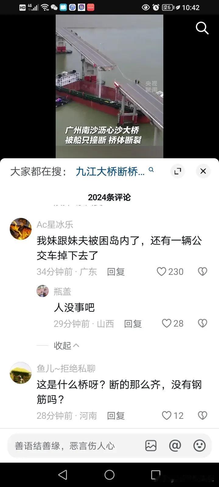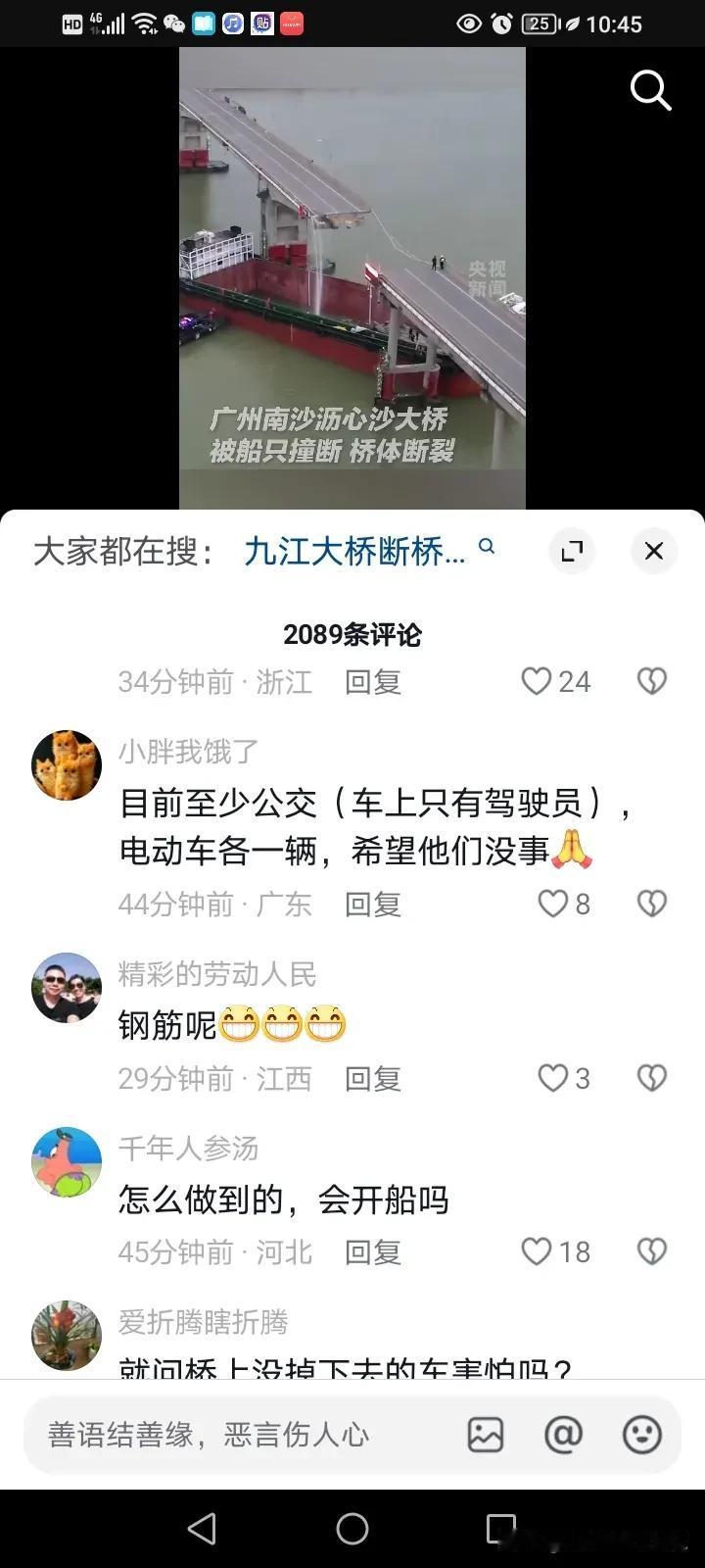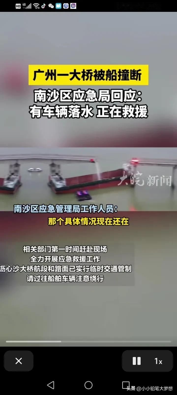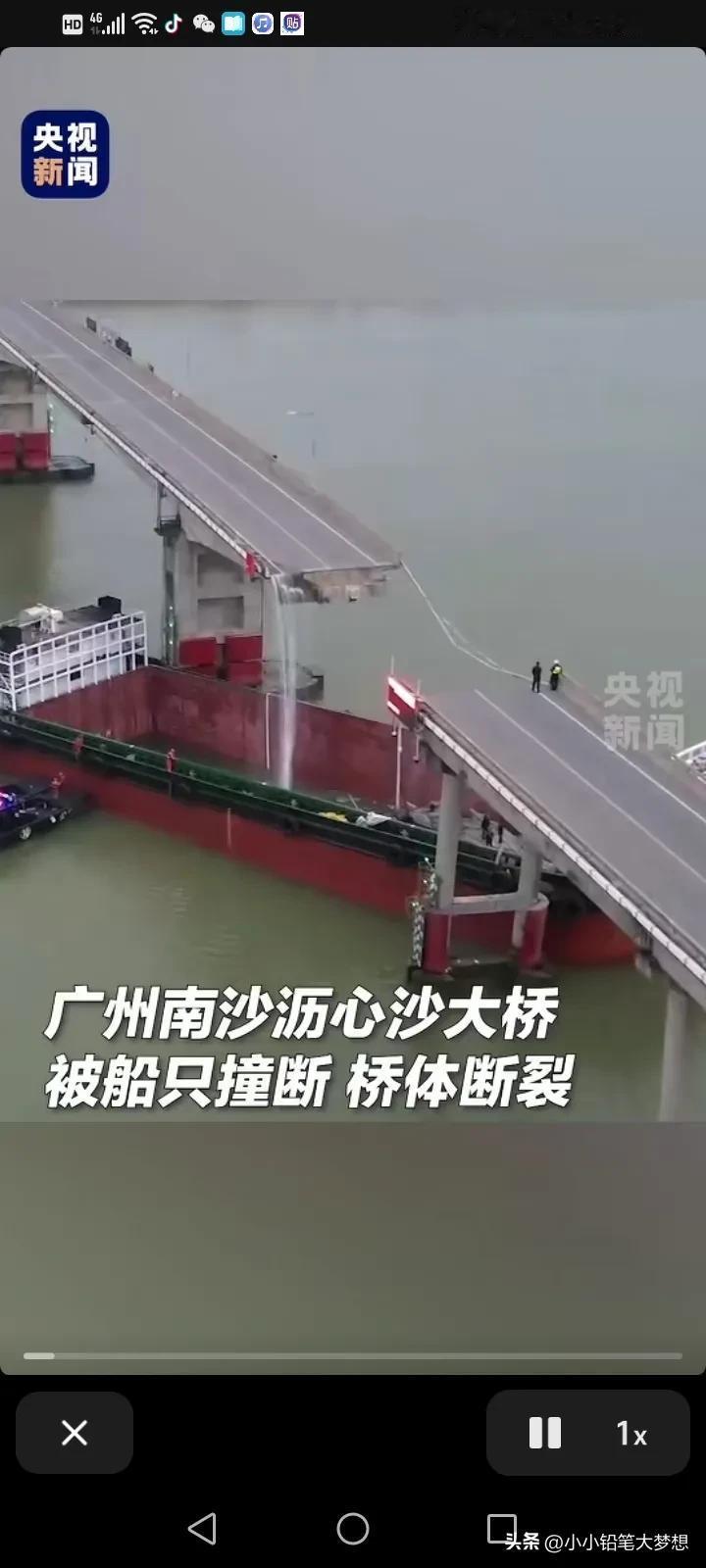 惨了,广州市南沙区万顷沙的沥心沙大桥被大船撞断了,多辆车掉了下去,现在知道的是有一辆绿色的公交车,还有两辆电动车。 一位知情人表示,他说自己的妹夫和妹妹都被困在岛上,现在这里也实行了交通管制。 因为是事发在今天凌晨五点30分,所以公交车上只有司机一人,这是万幸的,因为当时车流量并不多,具体掉落多少车辆,人员伤亡多少?现在还没有出具体数据,现场人员在紧急救援。 这是一艘空载的集装箱船,从佛山南海开往广州南沙,途中航行洪奇沥水道船撞到了沥心沙大桥的桥墩,然后造成了桥面断,我看这个桥面的被撞断的缺口很大,桥面上的自来水管也被撞破了,估计两岸的居民也要停水。 集装箱船内可以看见一辆绿色的公交车,被撞击的稀巴烂,也可以清楚看见有消防人员在救援。 依稀记得九江大桥被撞的事件应该也有20年了,这次又是什么原因呢?是大桥年久失修,质量有问题?希望相关部门,调查清楚原因,公布于众。 希望掉下去的人员安然无恙吧,老天保佑! #我来唠家常# #记录我的2024#