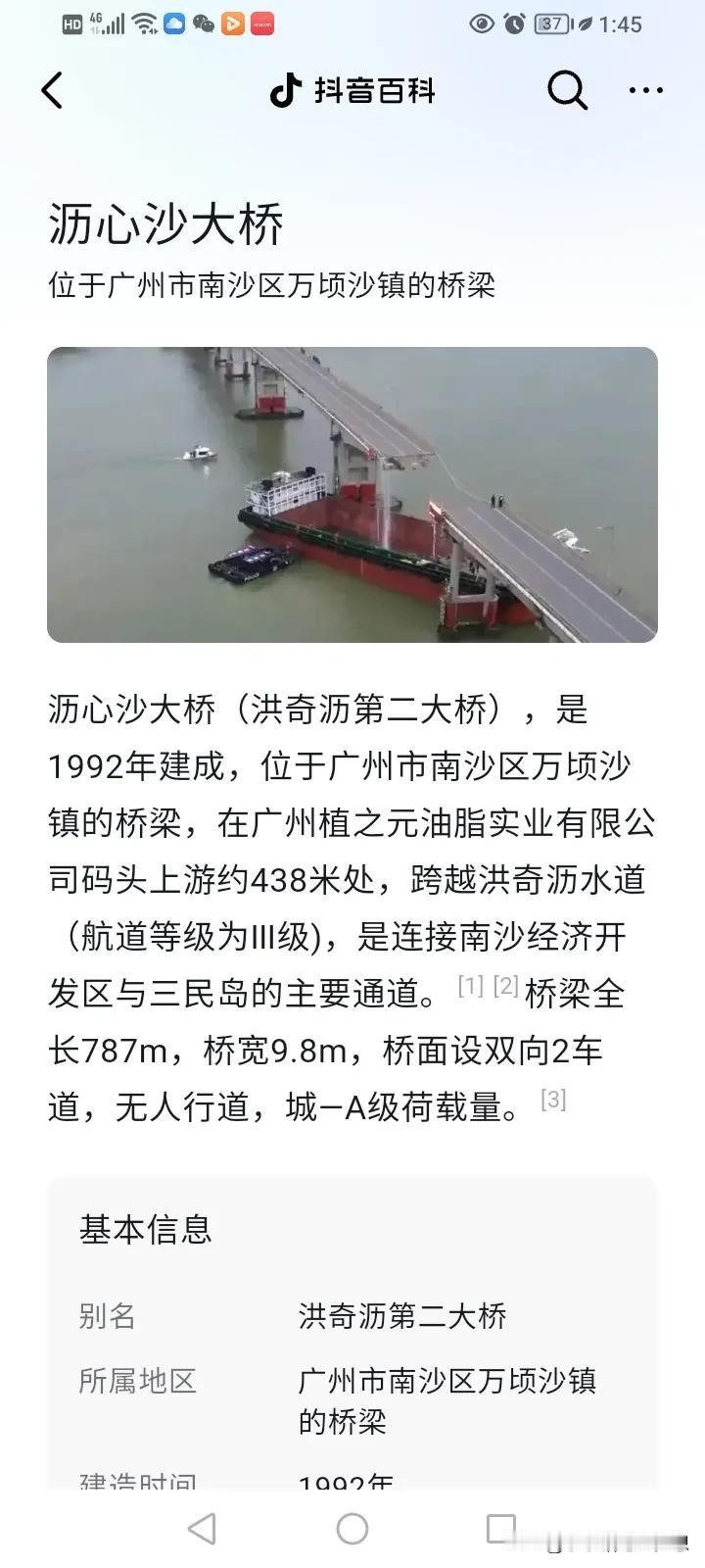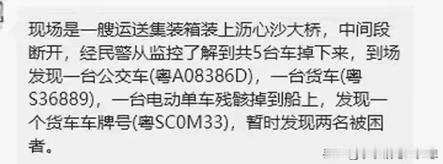 集装箱空船撞击广州市南沙沥心沙大桥造成桥面塌落造成2人死亡,3人失踪,涉事船为良辉 688,上月曾因在交通管制区时未加强瞭望,被罚款人民币三万元整。这艘船长60米,船高18米。 查看后台数据,船在5点29分的时候发送过一次位置,当时的航速约4.6海里/时、即8公里/时),吃水深度约为2.6米。 从被爆出来的图片显示,整艘船损伤不大,只有船头顶部挤压变形,事故原因还在排查,但是涉事的船主已经受到控制了。 查监控发现5辆坠落,3辆掉落全身,2辆掉落水中,2人死亡,2人获救,1名船员轻伤,3人失联,5辆车其中包含电动摩托车1辆,公交1辆,货车2辆,另一辆是什么车没交待。 这是截止到早上十点钟的数据,事故发生是在今天早上5点30分左右,村民说当时听到巨响,窗户也震动了,那时候还不知道桥被撞断了,当他们要外出的时候,才发现桥被封了。 还好不是车流量最大的上班高峰期,庆幸的是公交车上当时只有司机一人,桥面断了,所以自来水也断了,两岸居民已经停水了,唯一出岛的桥梁也封闭了,但是应急预案启动了,岛民可以通过渡轮外出。 南海救助局启动了应急预案,专业救援队携专业设备到达现场救援,包括一些专业潜水设备,专业水下搜索设备。 这是一座老桥了,1992年建的,至今也有32年历史了,2009年维修加固过,2019年引桥箱梁出现较严重的病害限制15吨以上的车辆通行,2020年公告已加固修复,限重20吨。 #我来唠家常# #记录我的2024#