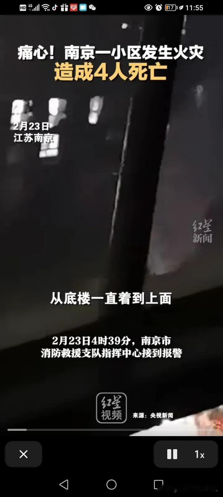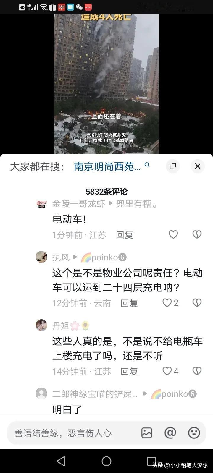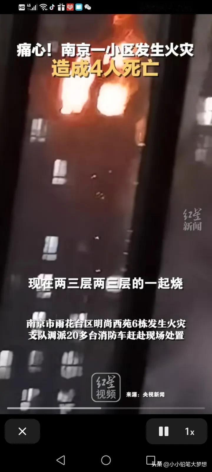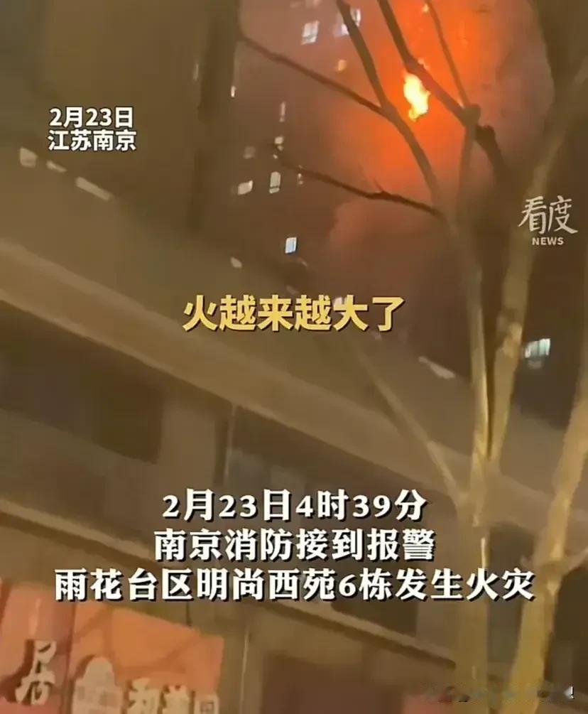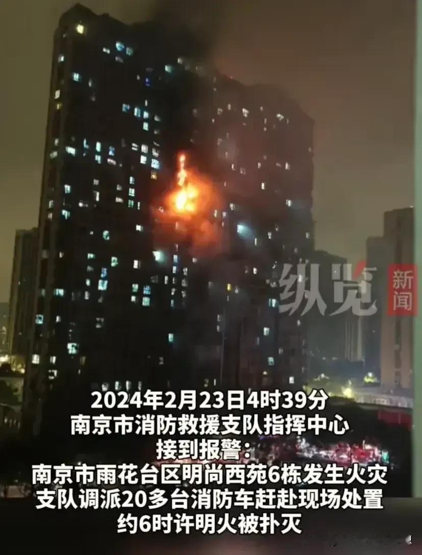 太惨烈了,南京一小区从底烧到顶致4人死亡,知情人透露起火原因,太可恨了!一位市民说,小区从底楼一直往上烧,30多层烧通了,当时先从中间起火的,然后一层跟着起火了,两层三层的烧起来,现场浓烟四起,时不时发出噼里啪啦的爆炸声,简直太吓人了! 这个小区位于南京市雨花台明尚西苑6栋,消防员通报中说到火灾的接警时间是2月23日凌晨4点39分,当天派出了20多辆消防车,明火是在6时许扑灭的,不幸的是,火灾造成了四人死亡,具体原因还在调查中。 知情人说,这个小区都是安置房来的,起火原因是因为24楼有一户业主把电动车搬到自家充电,凌晨电动车自然发生爆炸,然后火花掉落到一楼,这个位置刚好又是小区堆放电动车的一个位置,然后连带性的起火,噼里啪啦的连续性发生爆炸,因为爆炸所以火花四溅,火星通过管道迅速蔓延,造成了从一楼烧到顶楼。 一名这栋楼居民逃出来之后讲述了自己逃生惊恐的一幕,她说自己在睡梦惊醒,因为有人大喊着火了,救命啊! 她吓到从床上弹起,打开门之后发现,到处都是浓烟,呛的她不行,坏了,火快要烧到门口了,她急忙拿起了一条毛巾泡了一下水,捂住了自己的鼻子,想着从楼梯逃跑,本来想要往下走的,发现烟实在太大,下不去,然后她就往上走,但是没走两层,发现烟还是一样的大,浓烟一直呛着她,她感觉自己已经开始头晕,不行了,危急之中,她发现了一扇窗,立刻打开了之后,呼吸了几口气之后有所缓解。 然后她就发现烟慢慢的变小了,原来消防员来救火救人了。她跟着消防员下到一楼的时候,发现好几户人的家里大火还在燃烧,而且下面的电动车已经烧的面目全非了! 她很感激消防员及时的到来,救了她一命。 说了800遍,电动车不能入屋充电,但是这些人都是没脑子的,继续往家里推,这下好了,整栋楼都给烧的面目全非了,就像废墟一样,多少户的财产就这么被烧没了?财产没了,房子没了,那还能赚,那这个四个人人没了咋办? 这个年还没过完呢,发生这样的悲剧,真的是太悲痛了。 不得不说,这种小区隐患性太大了,一烧就一大片,而且火苗还能到处窜,实在太恐怖了。堆放电动车的地方居然没有自动灭火系统? #我来唠家常# #记录我的2024#