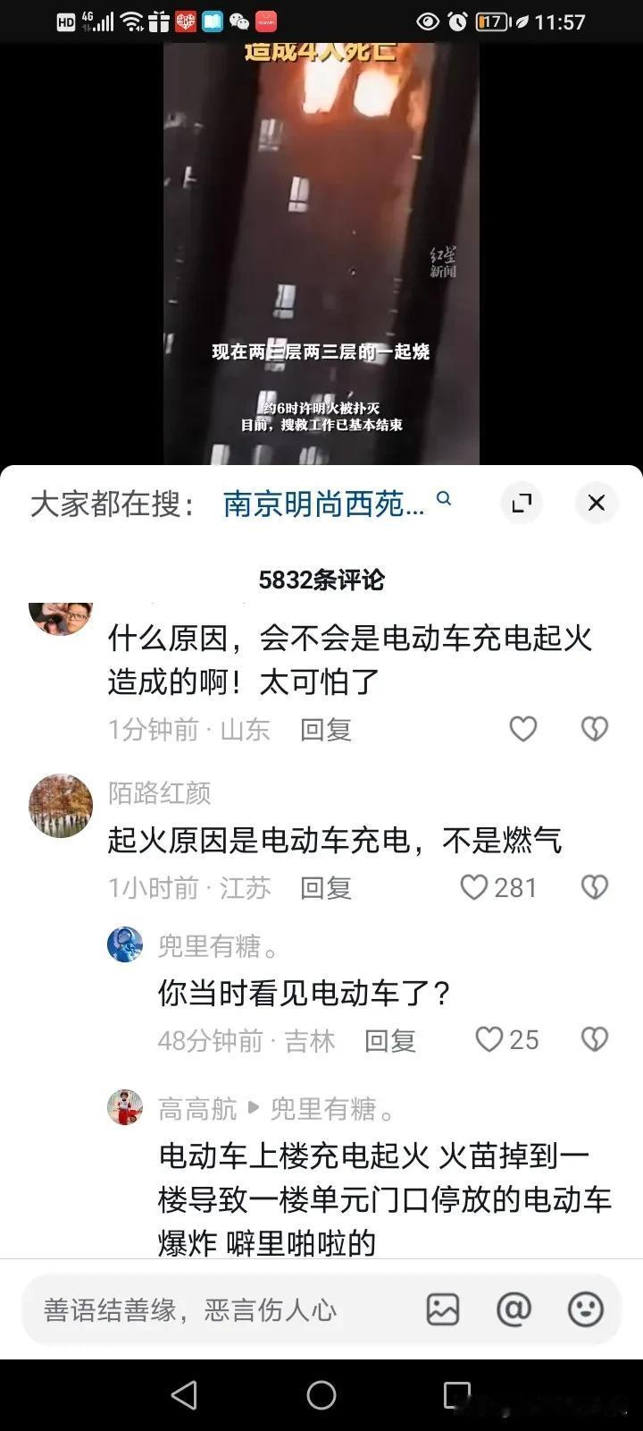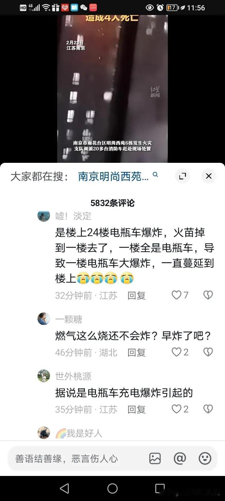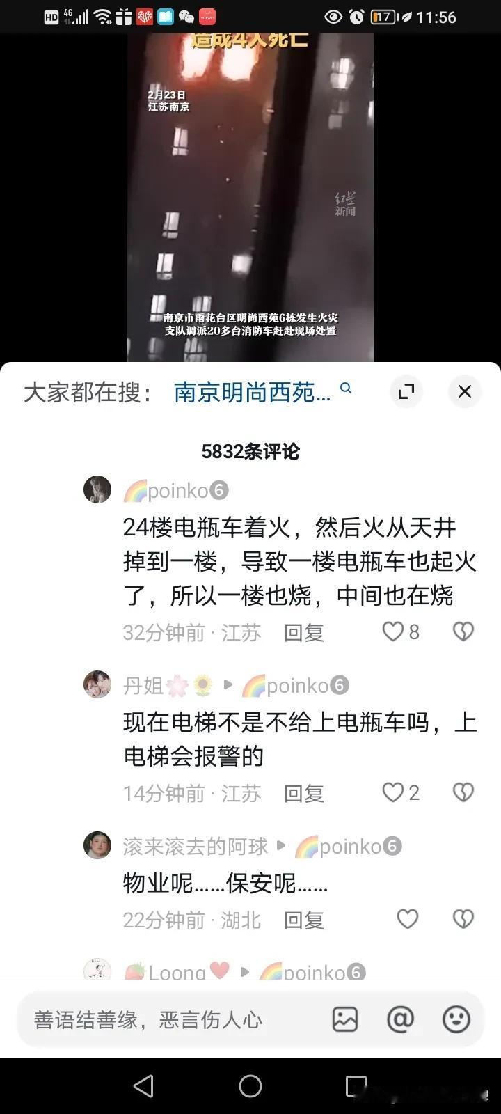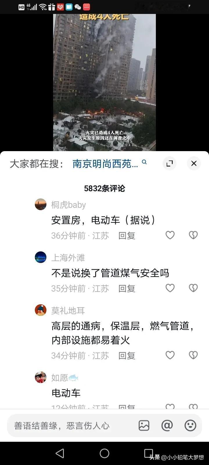 太惨烈了,南京一小区从底烧到顶致4人死亡,知情人透露起火原因,太可恨了!一位市民说,小区从底楼一直往上烧,30多层烧通了,当时先从中间起火的,然后一层跟着起火了,两层三层的烧起来,现场浓烟四起,时不时发出噼里啪啦的爆炸声,简直太吓人了! 这个小区位于南京市雨花台明尚西苑6栋,消防员通报中说到火灾的接警时间是2月23日凌晨4点39分,当天派出了20多辆消防车,明火是在6时许扑灭的,不幸的是,火灾造成了四人死亡,具体原因还在调查中。 知情人说,这个小区都是安置房来的,起火原因是因为24楼有一户业主把电动车搬到自家充电,凌晨电动车自然发生爆炸,然后火花掉落到一楼,这个位置刚好又是小区堆放电动车的一个位置,然后连带性的起火,噼里啪啦的连续性发生爆炸,因为爆炸所以火花四溅,火星通过管道迅速蔓延,造成了从一楼烧到顶楼。 一名这栋楼居民逃出来之后讲述了自己逃生惊恐的一幕,她说自己在睡梦惊醒,因为有人大喊着火了,救命啊! 她吓到从床上弹起,打开门之后发现,到处都是浓烟,呛的她不行,坏了,火快要烧到门口了,她急忙拿起了一条毛巾泡了一下水,捂住了自己的鼻子,想着从楼梯逃跑,本来想要往下走的,发现烟实在太大,下不去,然后她就往上走,但是没走两层,发现烟还是一样的大,浓烟一直呛着她,她感觉自己已经开始头晕,不行了,危急之中,她发现了一扇窗,立刻打开了之后,呼吸了几口气之后有所缓解。 然后她就发现烟慢慢的变小了,原来消防员来救火救人了。她跟着消防员下到一楼的时候,发现好几户人的家里大火还在燃烧,而且下面的电动车已经烧的面目全非了! 她很感激消防员及时的到来,救了她一命。 说了800遍,电动车不能入屋充电,但是这些人都是没脑子的,继续往家里推,这下好了,整栋楼都给烧的面目全非了,就像废墟一样,多少户的财产就这么被烧没了?财产没了,房子没了,那还能赚,那这个四个人人没了咋办? 这个年还没过完呢,发生这样的悲剧,真的是太悲痛了。 不得不说,这种小区隐患性太大了,一烧就一大片,而且火苗还能到处窜,实在太恐怖了。堆放电动车的地方居然没有自动灭火系统? #我来唠家常# #记录我的2024#
