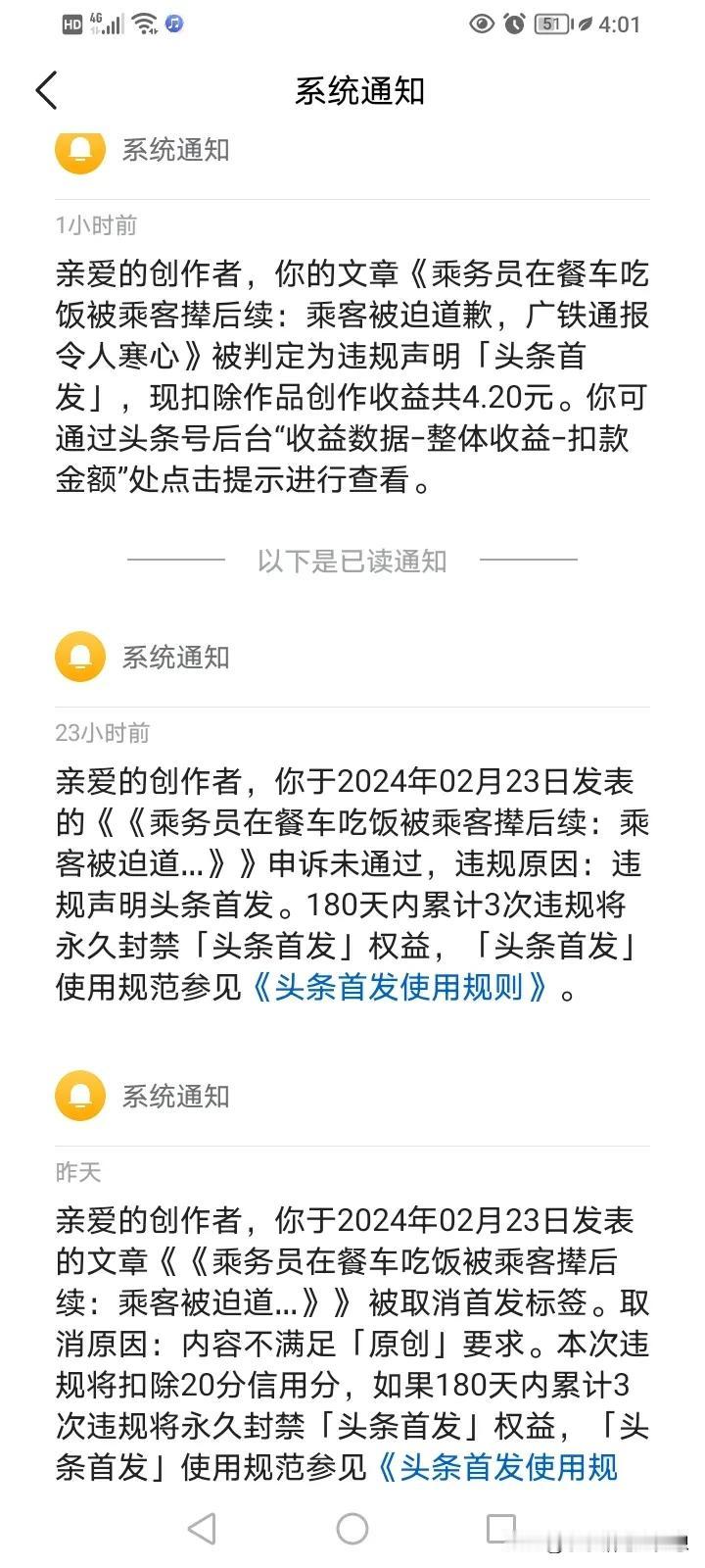 踩了个大坑,以后这些热点千万不能写,谁写谁倒霉,冤都冤死,上两天写了一篇《乘务员在餐车吃饭被乘客撵的文章。 写完之后没有暴,我也没在意,结果昨天给我发来了一条系统消息,说原创没过,摘掉首发,还要扣20分,还要扣回这篇文章的收益,我一下就懵了,这里面每一个字都是我自己原创写的,何来的不过原创? 然后系统给我发来了两个链接,说之前有人比我写的早,我一看懵逼了,我跟他的观点完全不一样,怎么可能不过原创,结果细看了一下,原来是乘务员和乘客的对骂,我俩都根据视频都一一的呈现,那就完蛋了! 那他先写就占理了,问题我也不知道他也写了,而且我也没拜读过他的文章,我知道他写我自己肯定就不会这样写了,那问题就出在我两都是根据原视频的素材写的,都是乘务员和乘客的原话,那就完蛋了,我心里面太冤了,我就去申诉,结果申诉没过。 客服说,这种也不行,原来乘客的原话也不能全部呈现在文章里,明明自己打了双引号也没有用,头条就说不行,不能过,而且他说截图也不算原创。 吃一堑长一智吧,这些太热的热点,千万不要写,一写一个坑,因为太多人写,只有第一个人写的,可能就大爆款,后面的基本都不会暴,而后面写的话,基本都会踩雷。 #记录我的2024# #我来唠家常#