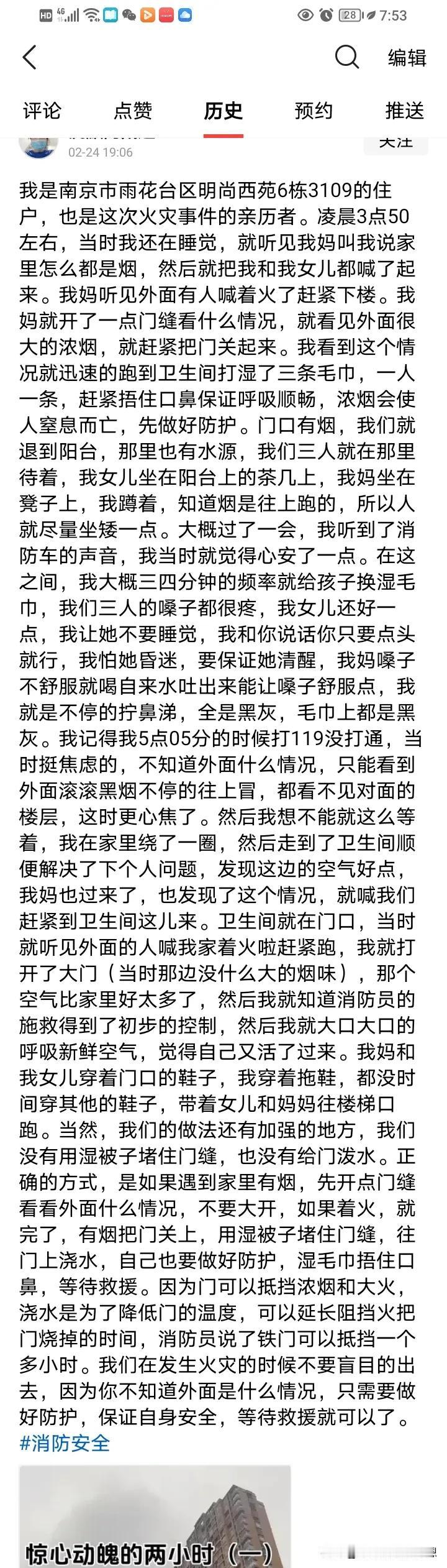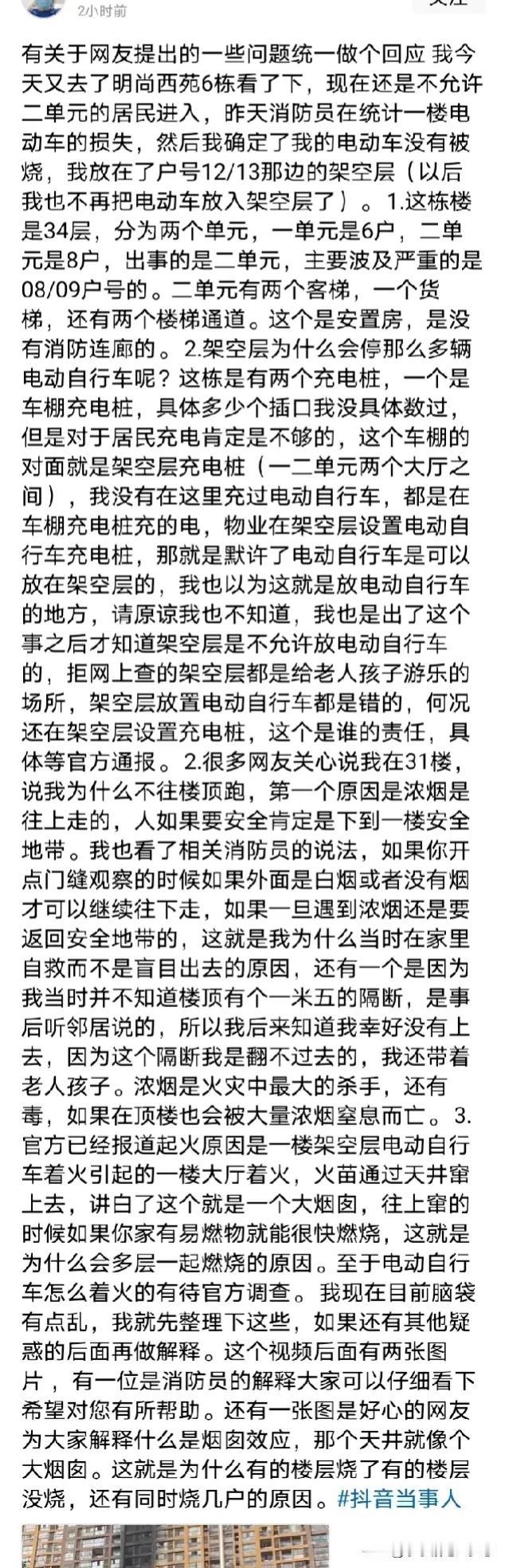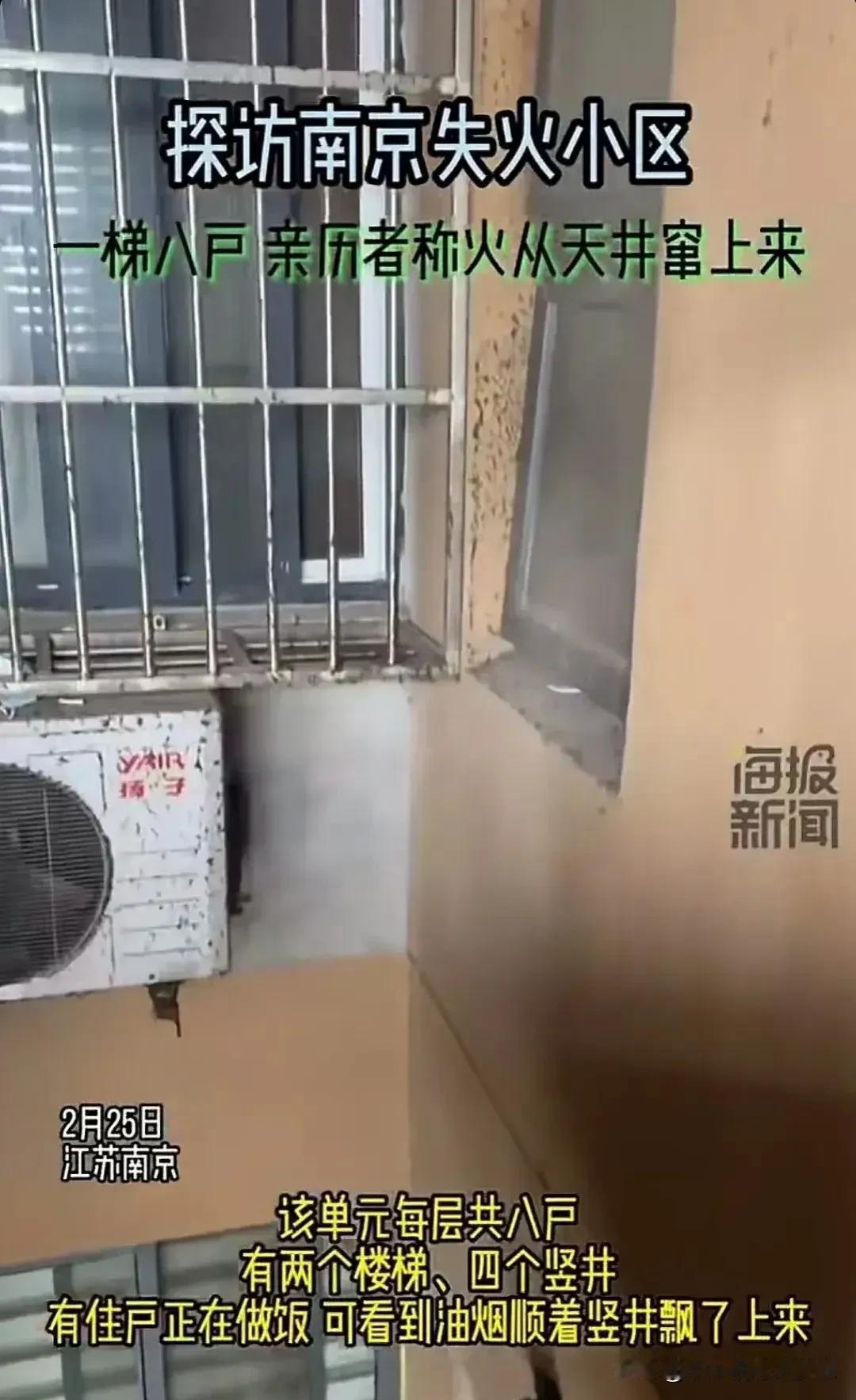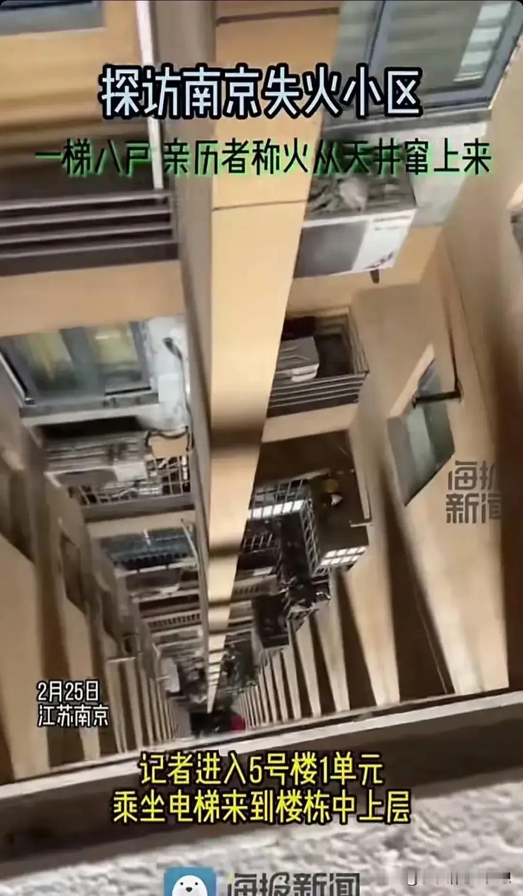 南京明尚西苑6栋31层的住户死里逃生,他道出了这次火灾为什么会跳着烧的真正原因,不是有人飞线,也不是所谓的保温棉,正如发布会里面所说的起火原因是架空层的电动车着火烧了一大片。 那为什么会跳着烧?那是因为这个小区的中间都有一个天井,这个天井一直直通到楼顶,当时发生火灾的时候,下面的火蔓延的非常快,电动车噼里啪啦的爆炸,然后通过天井直接往上窜。 当时死里逃生的亲历者也证实了她的说法,21层到31层一直往上烧,但是下面只有架空层着火,他们眼睁睁看着这些火苗往上窜,这里有网友解释了天井的烟囱效应。 从现场发回来的图片,我们可以看的清清楚楚,小区楼顶上面的天井已经被烧的漆黑。 很多人说,那这个开发商也是有问题,井道设计是合理的,要保证每户通风和光线,这里最主要的问题是,本来架空层就是供业主娱乐玩耍的地方,因为小区的电动车充电位置不够,也没有搭建足够的车棚给他们摆放。他们心疼自己的爱车遭受风吹日晒,然后这个地方也是最方便的,一下楼就能骑着自己的爱车上班,所以业主习惯性的停在这里了,然后小区物业也默认了,还在这里安装了供电动车充电的充电口,那么问题来了,充电口有了,但是配备的消防设施却不足,最起码是消防喷淋系统都没有安装。 其实,在一层有防火门关闭。这次火灾时防火门没关闭,在井道里的窗户外肯定放了杂物,谁家放杂物又是可燃的,谁家就引火上门,这也许是跳着烧的原因。 现在六栋就已经被封锁了,记者也跑到了五栋的天井看了,很多人的窗户外确实放了杂物,而且这里面很多空调外机挂着的,而且有人在做饭,这个油烟也顺着这个天井抽上去了。那一楼一大片电动车着火,这火一抽上来,这上面有很多垃圾,杂物,塑料袋,这一烧,这能不引火入屋吗? #我来唠家常# #记录我的2024#